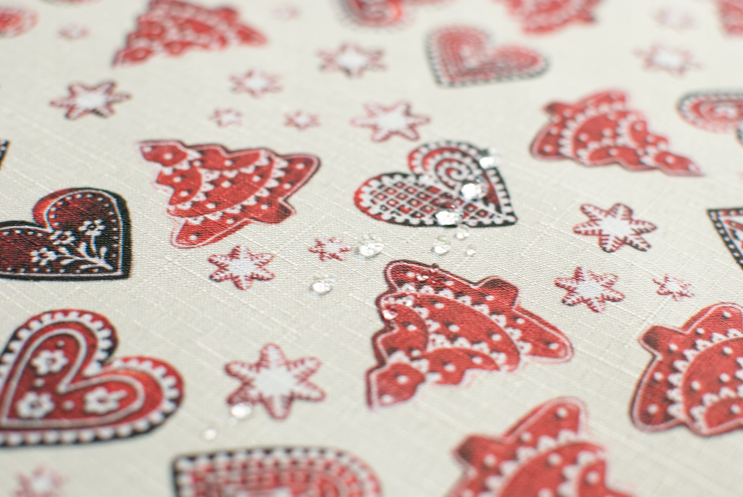 Рождественская скатерть в канун Рождества с рождественскими узорами: красные, со вкусом рождественские елки, пряники и звезда на кремовом фоне .