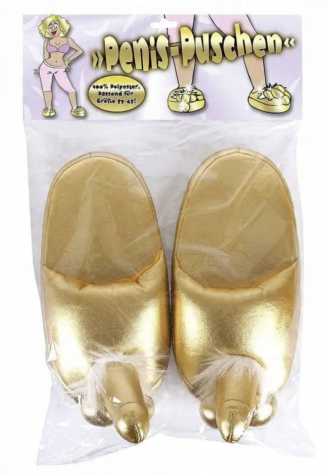Золотые тапочки с пенисами и яичками на носке.