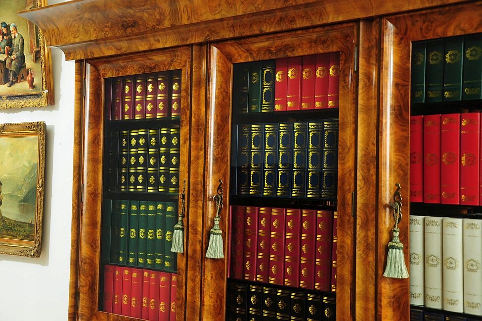 БИБЛИОТЕКА ВЫПОЛНЕНА В ЯНТАРНО-КОРИЧНЕВЫХ ОТТЕНКАХ.