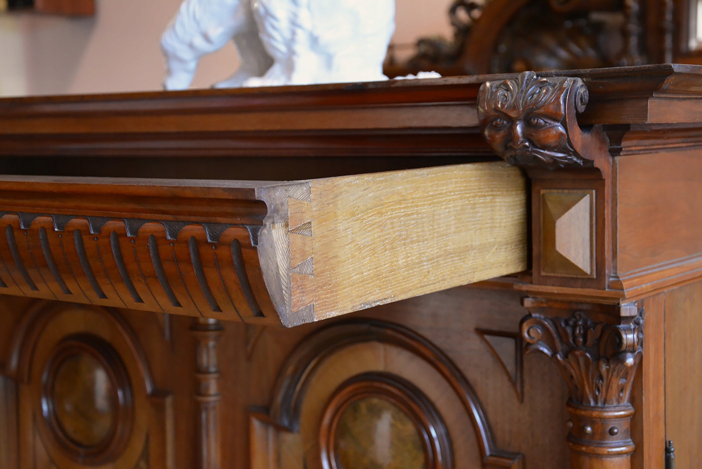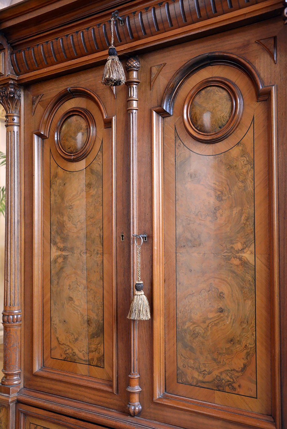 Veened с несколькими разновидностями ореховой дерева , включая эксклюзивный Chekot. Украшены высококачественными украшениями, характерными для эклектичного стиля. С двумя глубокими ящиками внизу. Лицо украшено черной нитью из -в -лодникового и inftcracker . Очень декоративная дверь. Украшенная черной нитью интрасессии, -рисунок винир и большие круги, заполненные выпуклыми опухолями, изготовленными из арахинирования вишни! /b> внизу, украшенная гравированной гравировкой в дереве с цветочными мотивами. Столбцы с большими corinthian capitals . мебель. В интерьере закругленная полка со стеклянными розетками! С стороны две резные маски тушь и декоративные рев. Примечательно, что красивый шпон, указывающий роскошный характер мебели. >