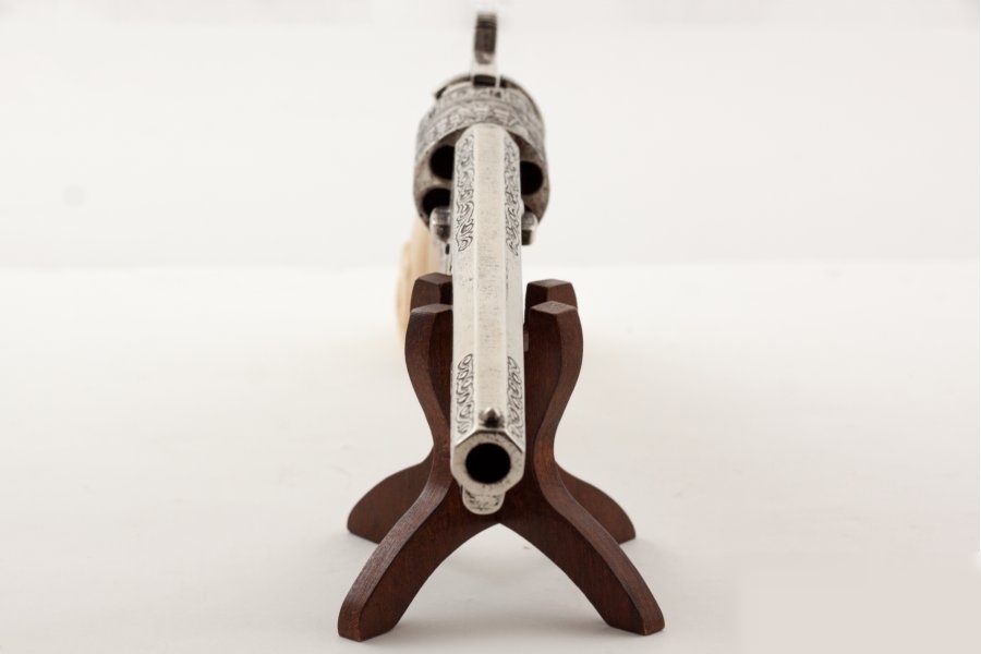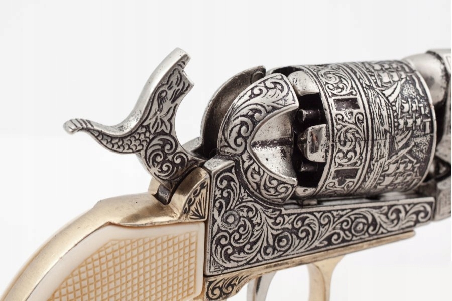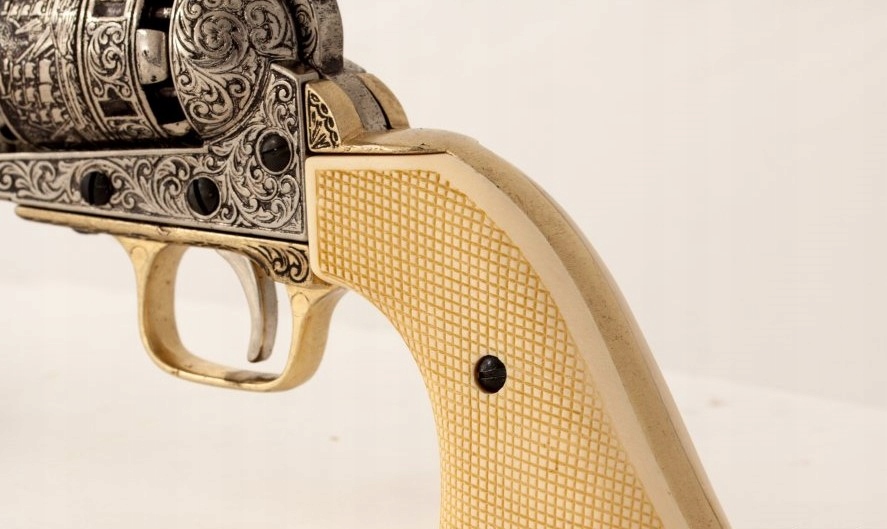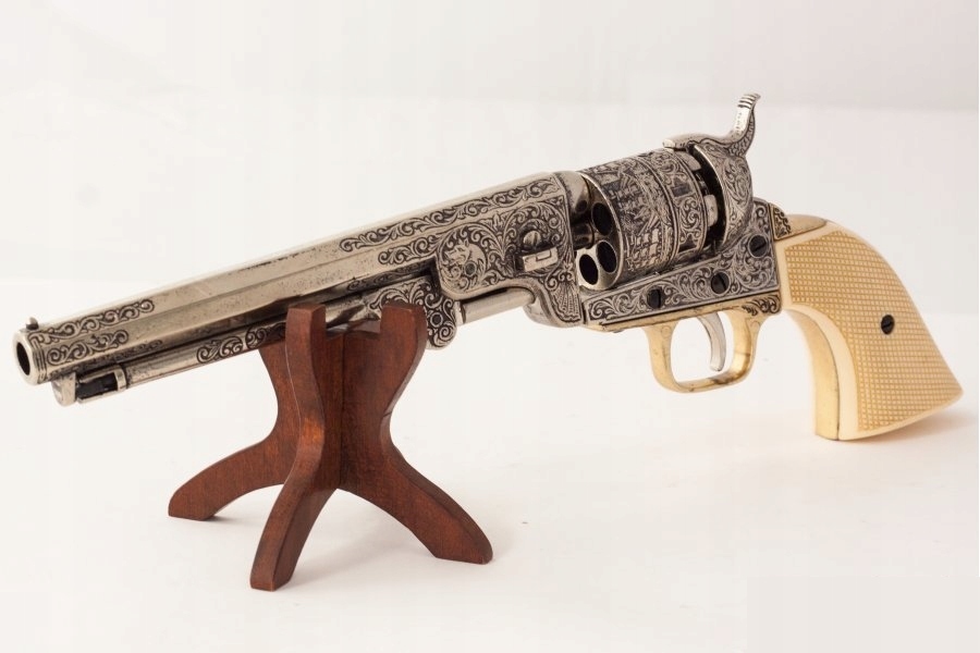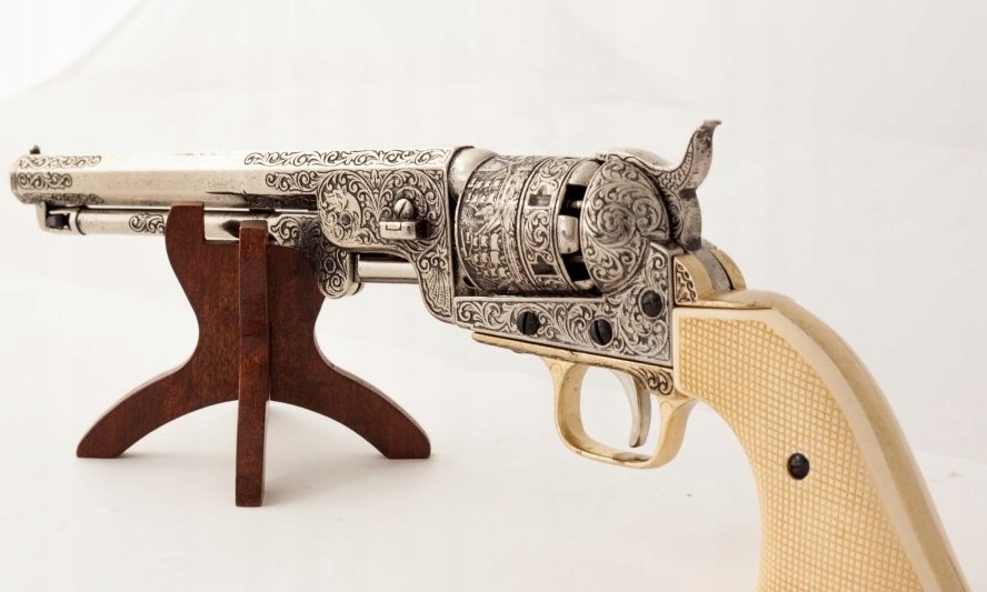 Реплика шестизарядного дульнозарядного револьвера Colt Navy 1851 года. в эксклюзивной версии. Реплика изготовлена из сплава ZnAl, отделана хромом и латунью, с накладками на ручки из материала кремового цвета, имитирующего слоновую кость. Ствол восьмиугольный.
