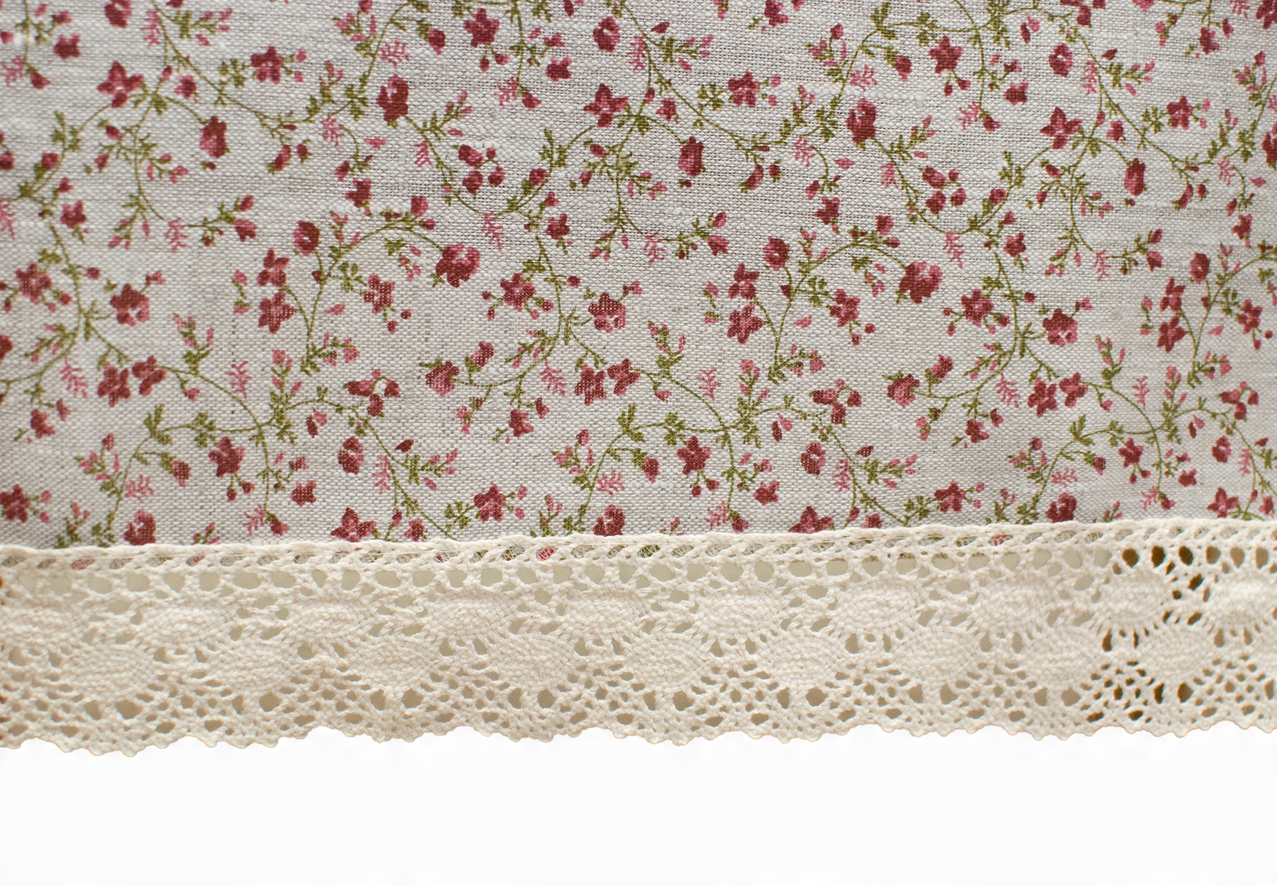 Цвет льняной ткани-белье-бейдж с красивыми, маленькими темно-красными цветами.