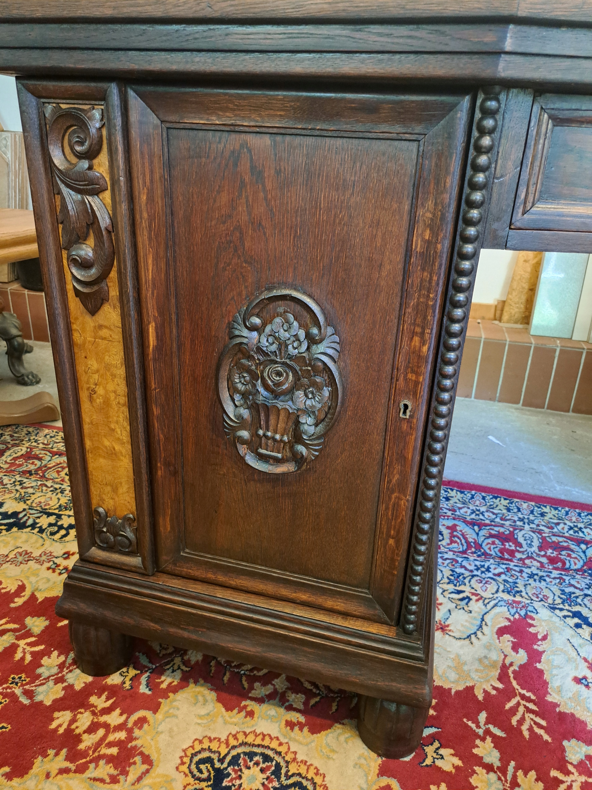 Очень хороший массивный и функциональный стол. Обновлен, восстановлен, это выглядит очень впечатляюще. Сделано в дюбине - винированном, отделанный с воском, большой, массивный и вместительный. Без коры жука и полостей с обеих сторон двери с резьбой и на панелях, что добавляет к нему дополнительное очарование. На левой странице 3 ящиков и справа 1 полка. Вместительный ящик в средней части. Под ящиком нога для ног 60 x 80 x 63 (ширина x deep x высота) стоит на восьми массивных ногах. Двойной стол. Это может стоять в середине комнаты. Действительно красивый стол!