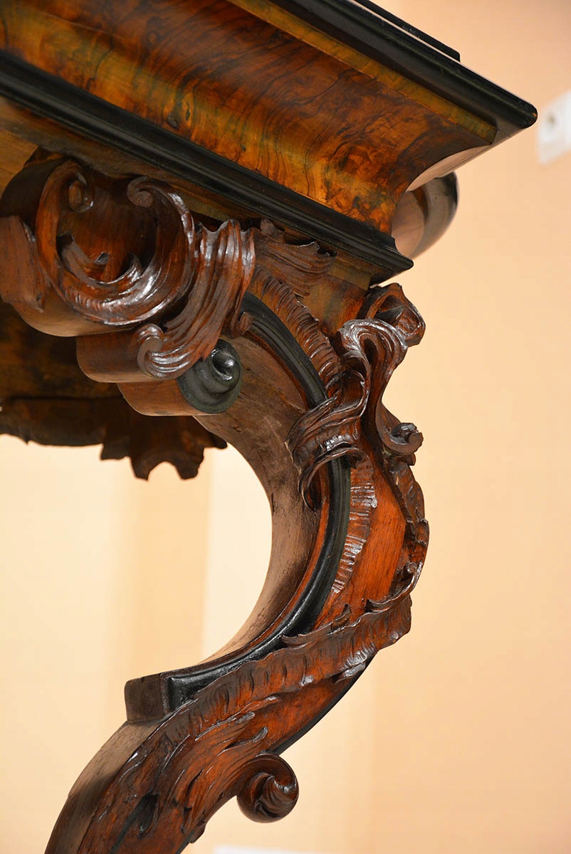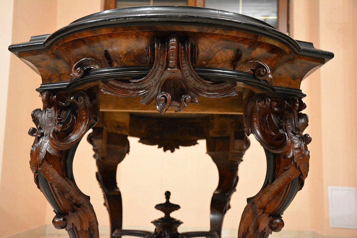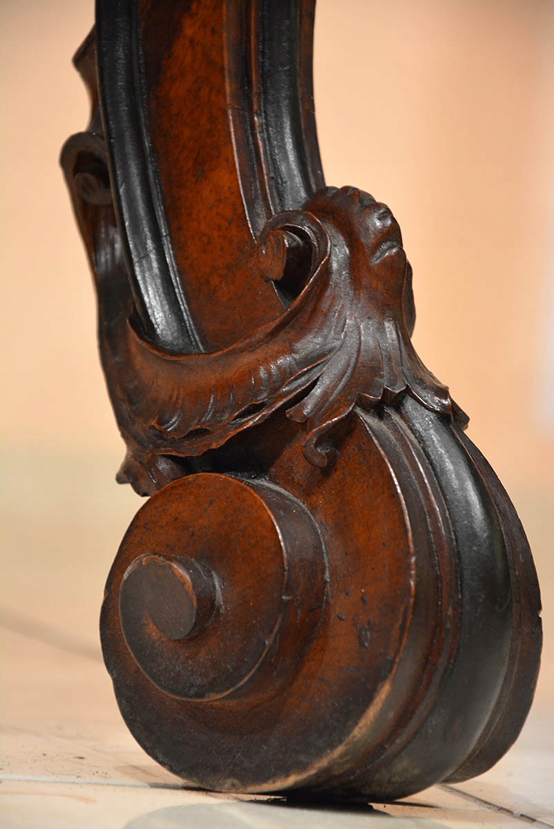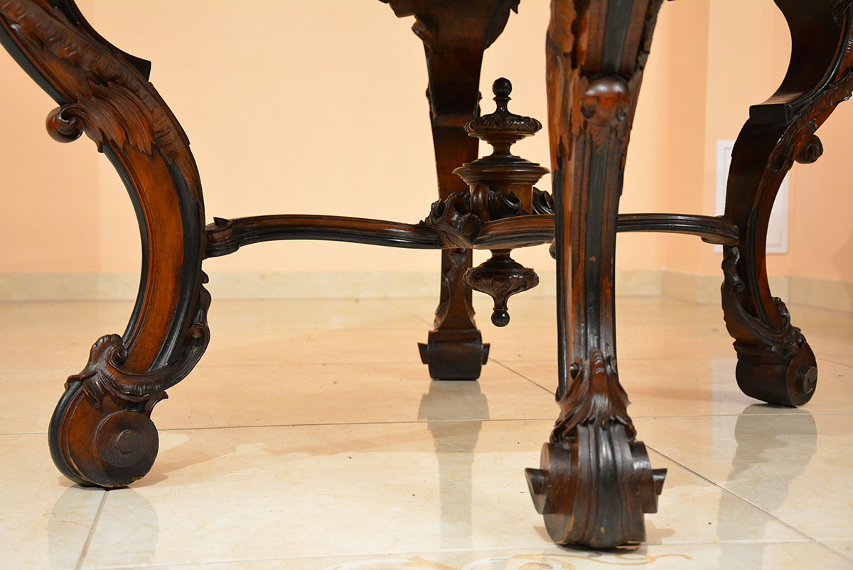 Столс овальной столешницей, со слегка волнистым контуром, опирающийся на четыре согнутых - сигмовидные ножки, заканчивающиеся красивыми волютами внизу. Ножки стола увенчаны исключительно богато резными рокайлями, характерными для стиля рококо. Обратите внимание на точность резьбы - нечто необыкновенное!