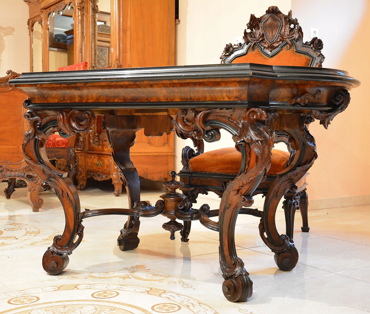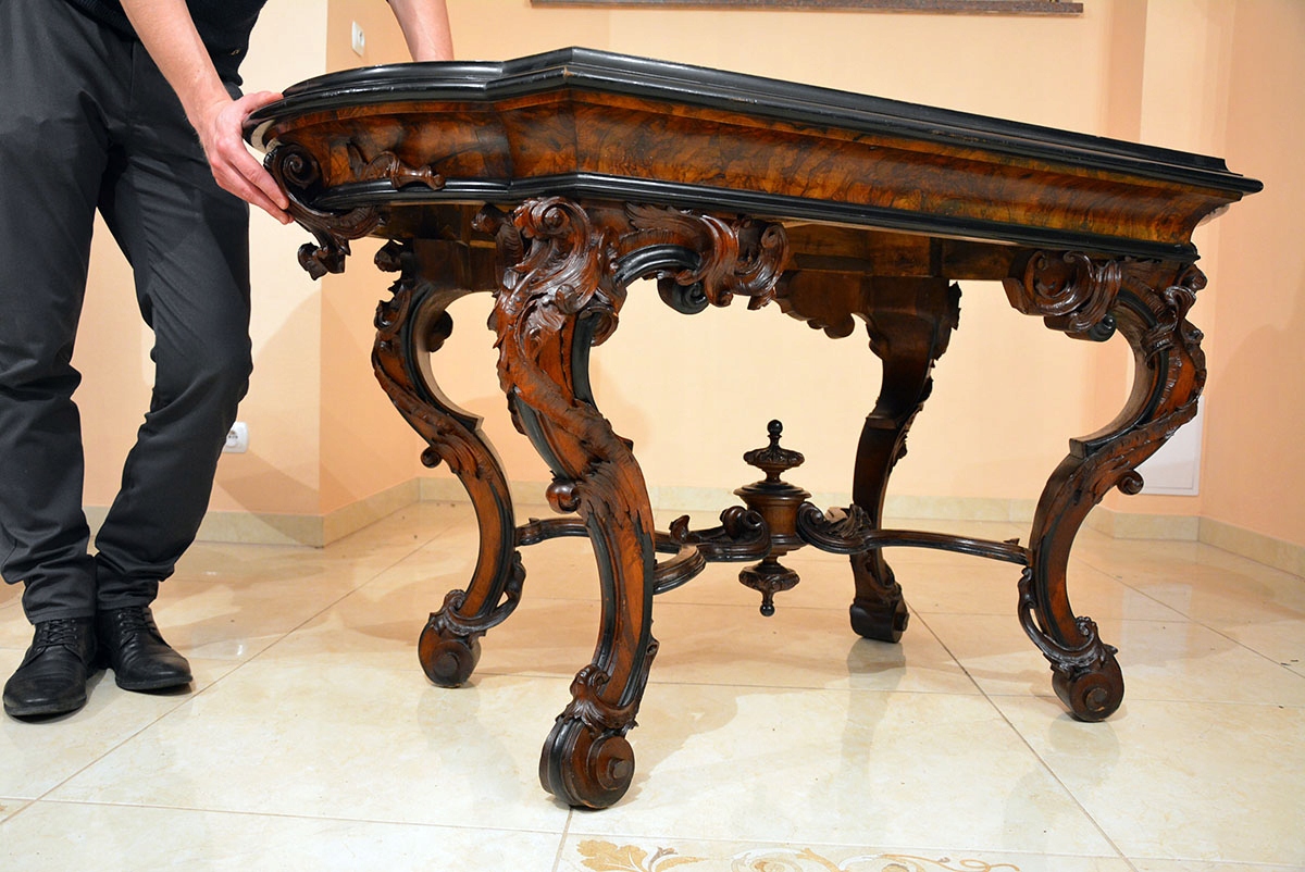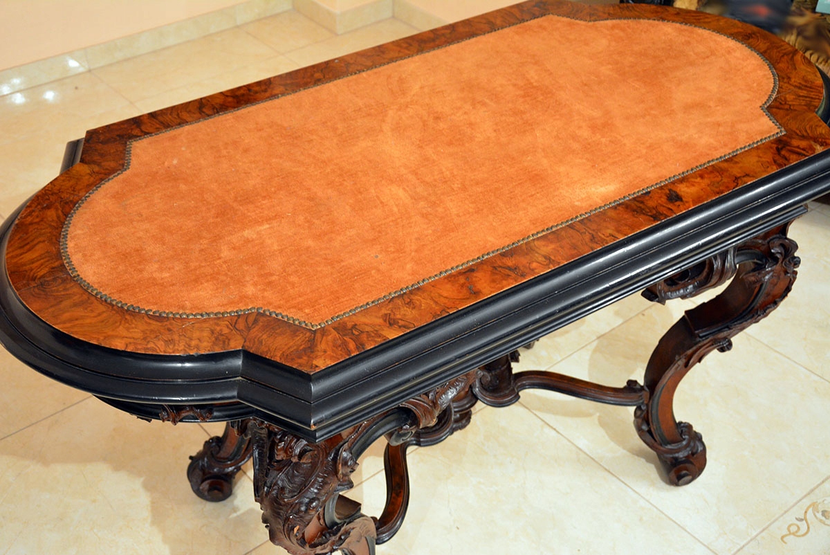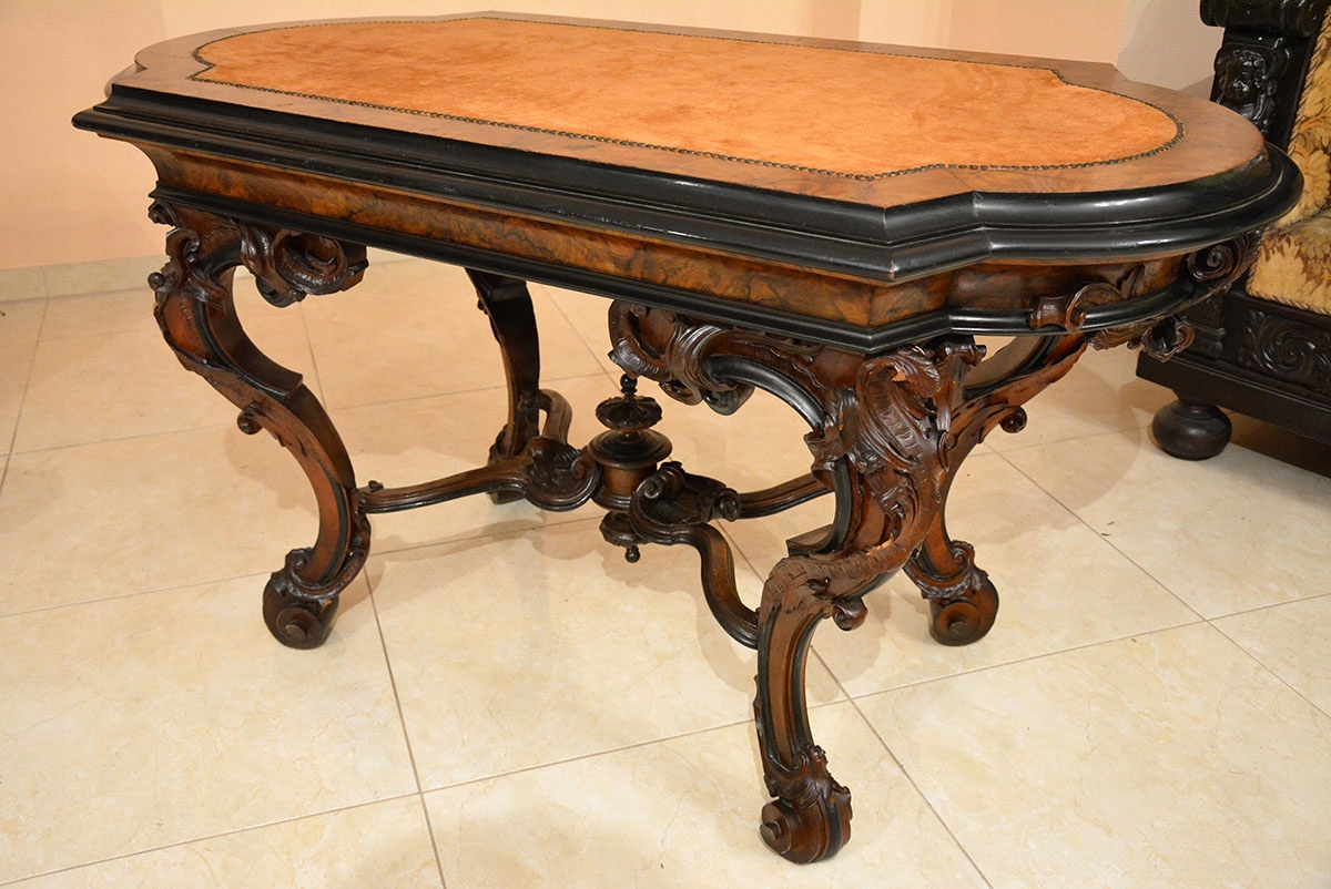 Столешница имеет волнистый контур, профилированный. Каркас и столешница частично чернены и, прежде всего, покрыты шпоном с очень узорчатым, что придает столу эксклюзивный характер.