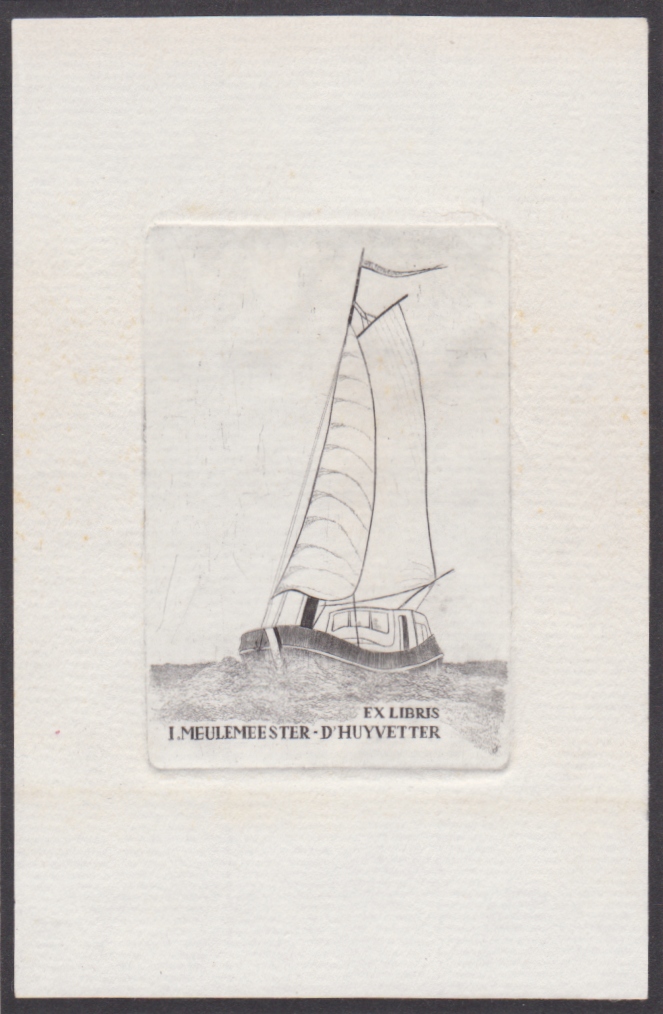 гравюра на меди, размеры: 4,6 х 7 см. Композиция с плывущим парусом, под которой скромным шрифтом надпись: Ex libris I. Meulemeester - D. Huyvetter