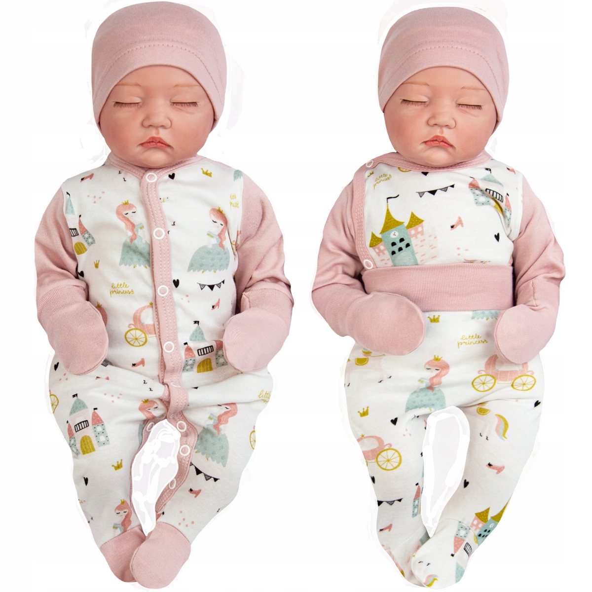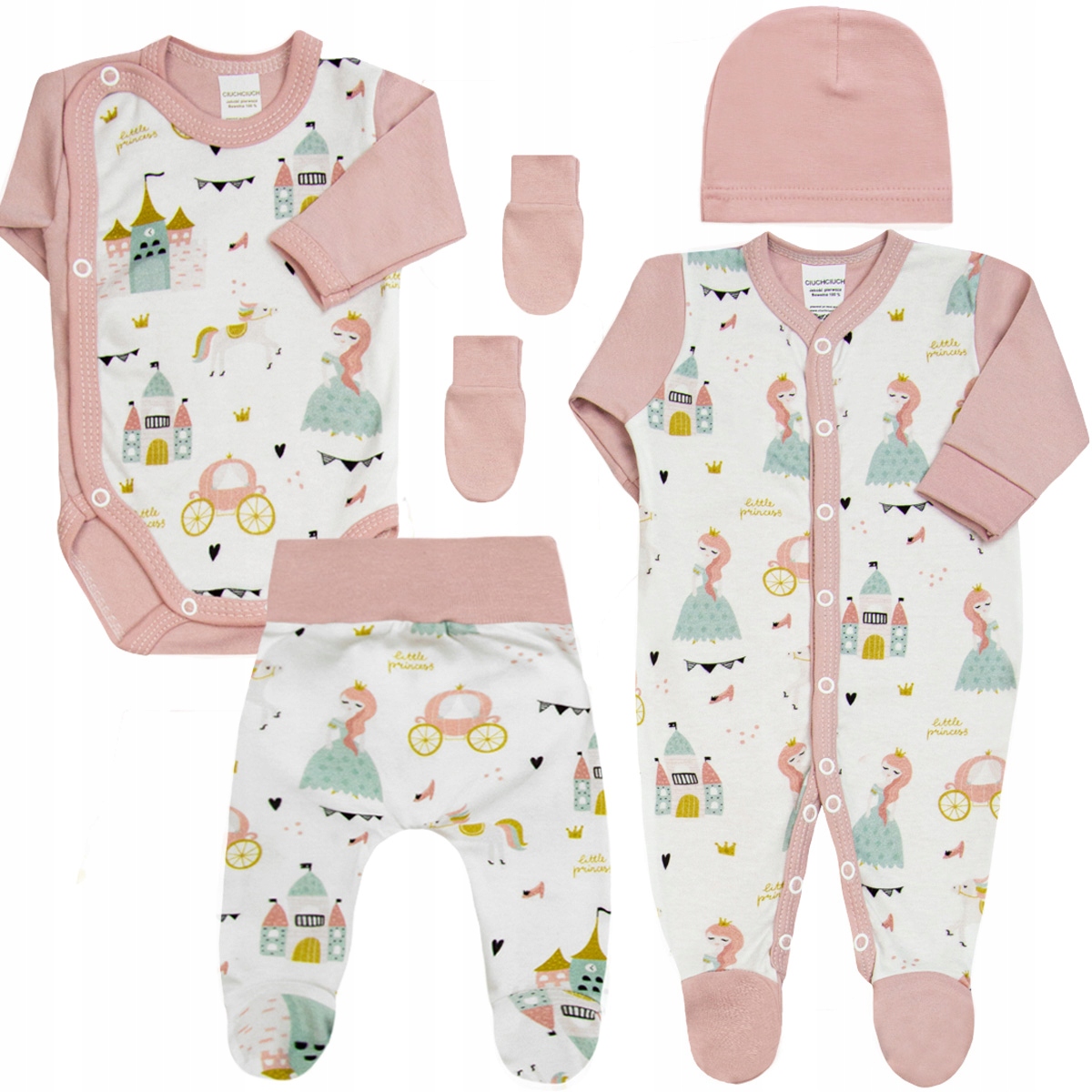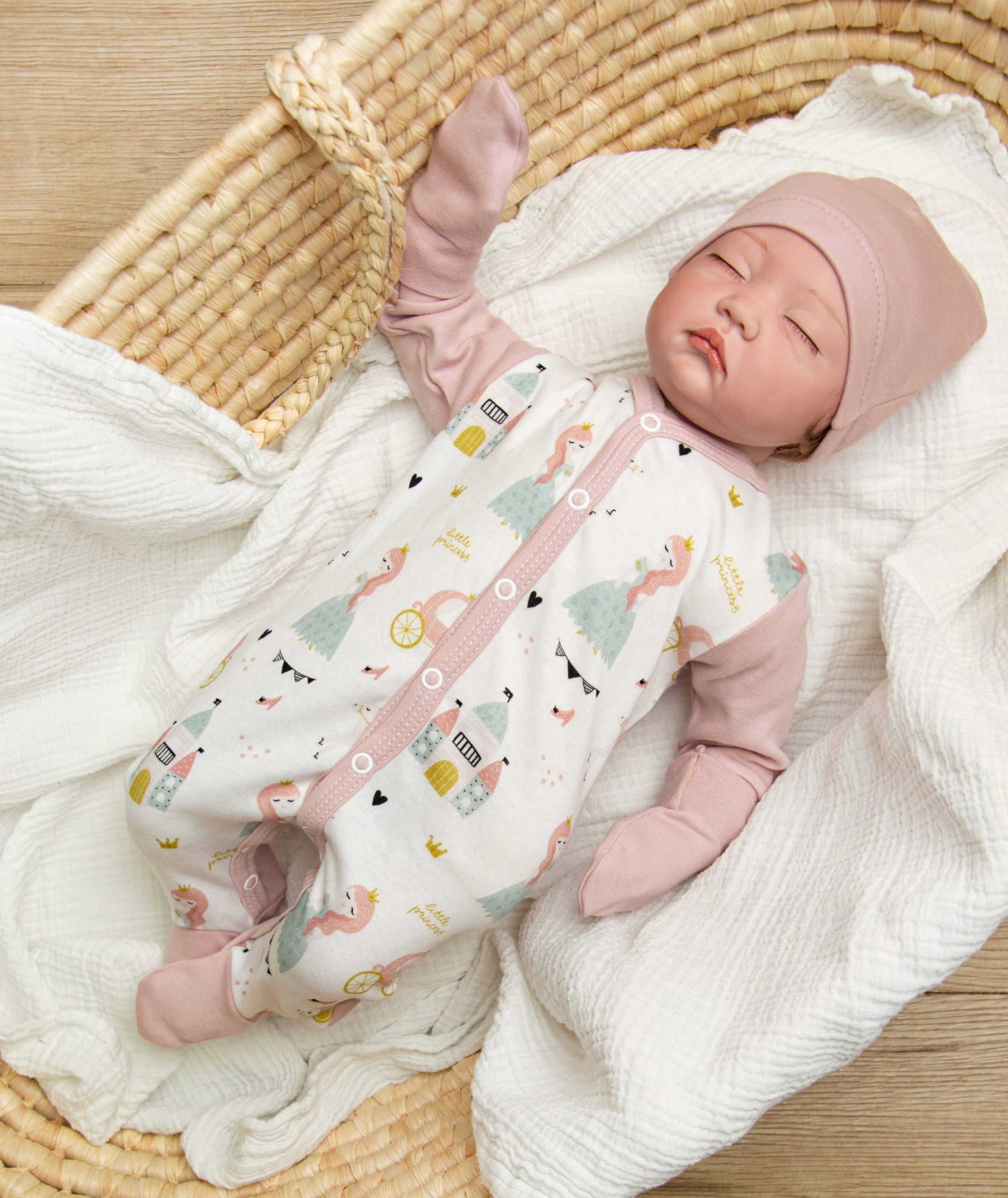 Хлопковая распашонка для новорожденного с нежным бело-розовым мотивом ПРИНЦЕССА - комбинезон, боди с молниями сбоку, слипы, шапочка и когтеточки.