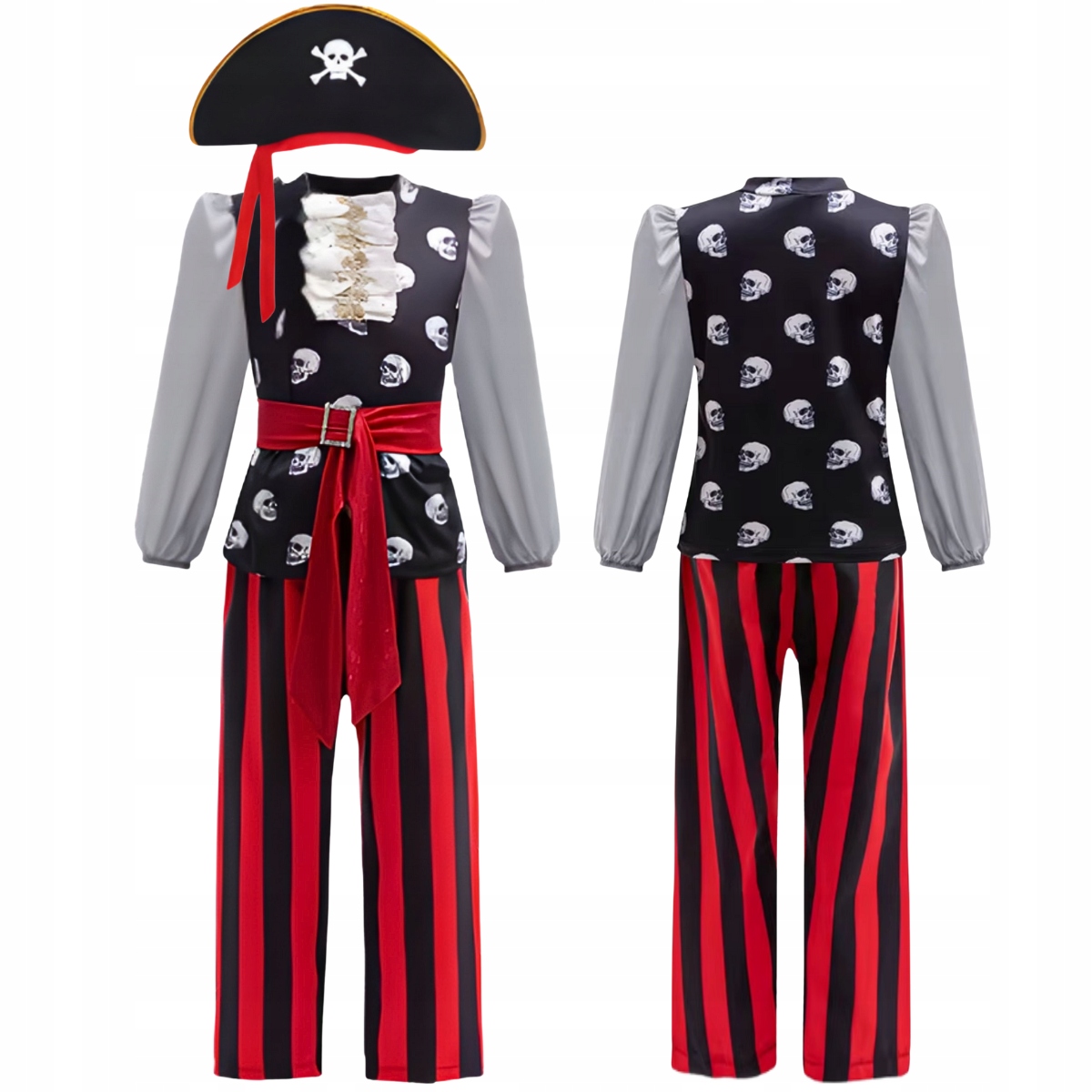 - В комплект входит: костюм пирата (толстовка+штаны), пиратская шапка, 2 повязки на глаза, игрушечная сабля, телескоп, компас, монеты, сумка с принтом черепов.
