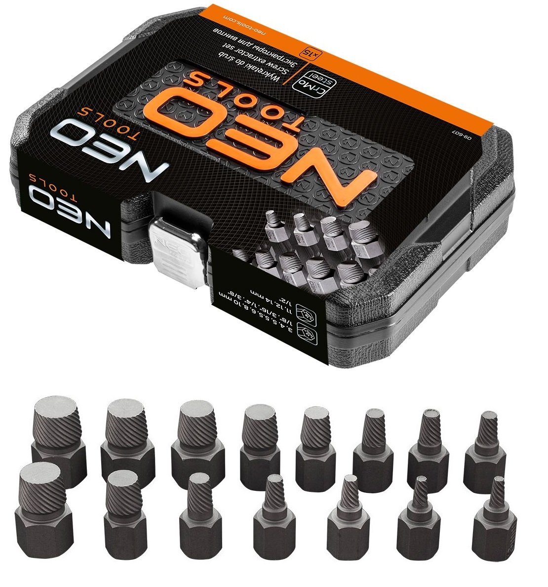 Экстракторы для сломанных винтов, набор из 15 шт.09-607 NEO Изготовлены из прочной хромомолибденовой стали, обеспечивающей длительный срок службы. В комплекте 15 экстракторов размерами: 3, 4, 5, 5,5, 6, 8, 10, 1/8", 3/16", 1/4", 3/8" мм с головкой 12 мм и 11 мм. , 12, 14, 1/2” мм с головкой 16 мм.