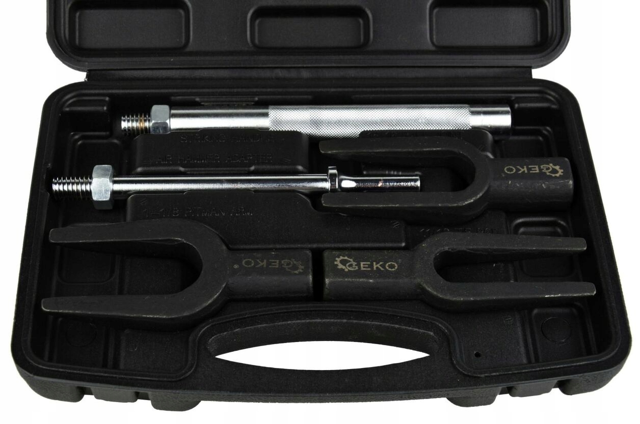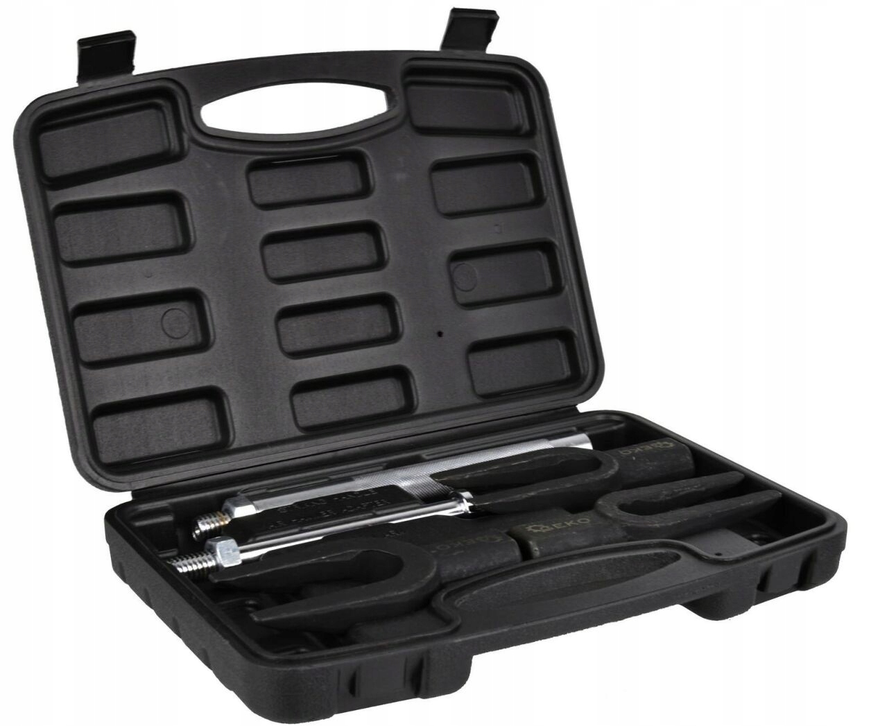 Набор вилочных съемников для рулевых тяг и шаровых пальцев из хромванадиевой стали (CrV). В комплект входят три вилочных съемника с внутренней шириной 28, 24, 17 мм и две прижимные ручки, приспособленные для работы с пневматическим или ручным молотком. Рычаги вилок съемника имеют прочные и ровные клиновые поверхности, позволяющие легко и точно закрепить шаровые пальцы и рулевые тяги.