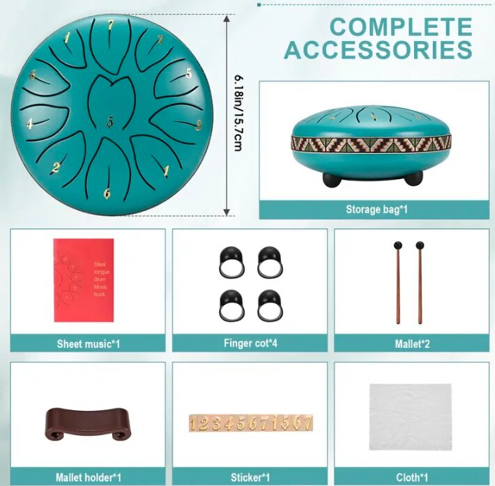 Практический инструмент для начинающих и легко учиться. Барабан имеет диапазон 11 тонов и излучает чистый и необходимый, очень стабильный, звук. Этот инструмент подходит для различных применений, включая музыкальное образование, йогу, медитация, упражнения с дзен, духовная реабилитация, мечты и молитвы и концертное сопровождение. Следуйте своему сердцу и исследованиям, очистите свой разум и дух и достигайте внутреннего мира.