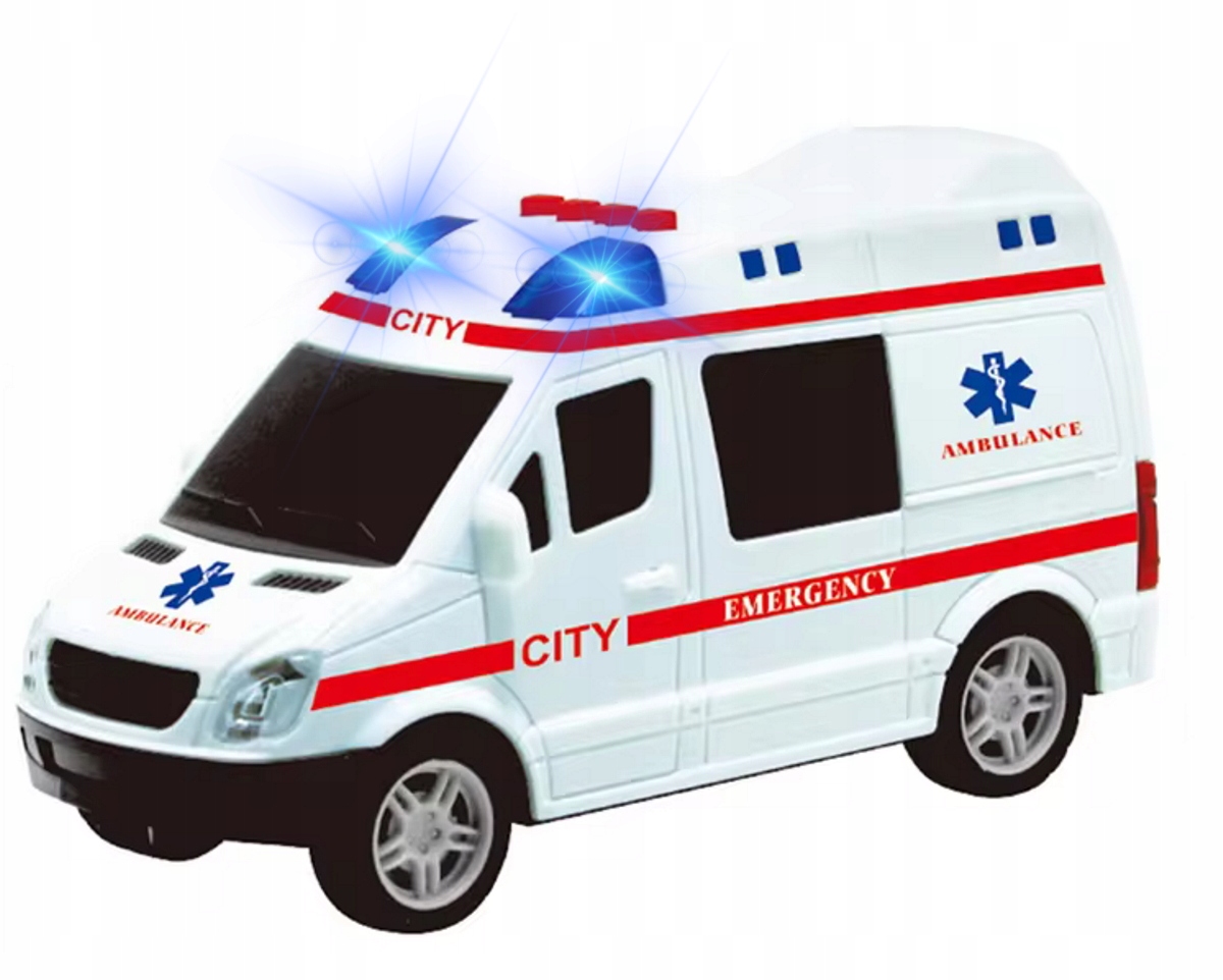 Машина скорой помощи имеет фрикционный привод – ускорьте передние колеса и дайте машине свободно передвигаться по полу или столу, и машина будет двигаться вперед самостоятельно.