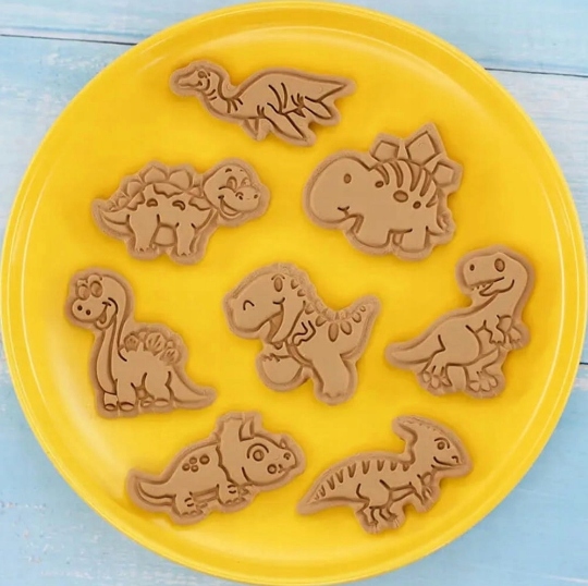 В наборе 8 шт формочек для печенья разных размеров с мотивом динозавра. Они изготовлены из очень прочного материала. Идеальные формочки для печенья и сахарной пасты. Подходит для контакта с пищевыми продуктами.