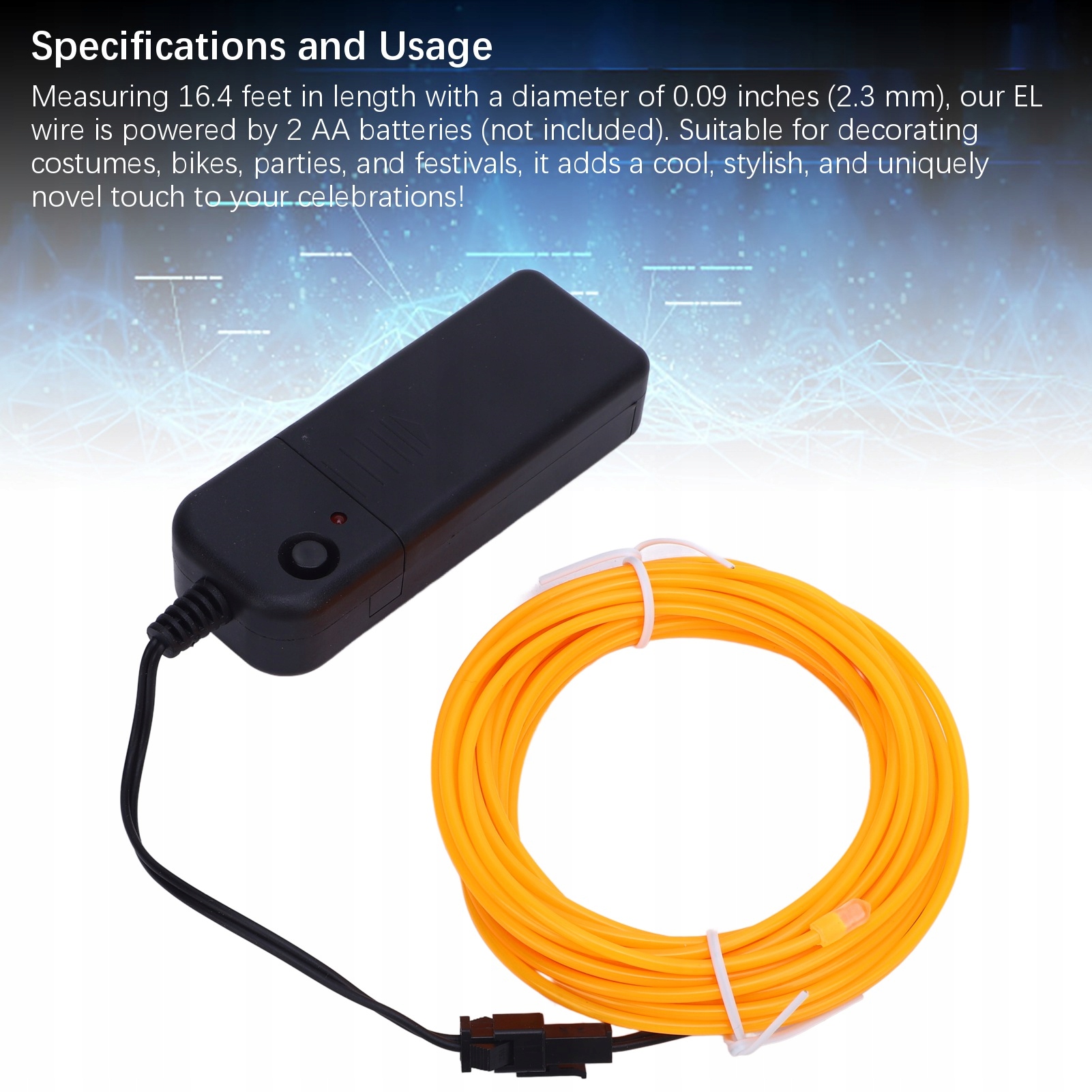 5. Технические характеристики и использование: измерение долговечности 16,4 фута диаметром 0,09 дюйма (2,3 мм), наш провод EL питается на 2 батареи AA (не пахнет). Подходит для украшения костюмов, мотоциклов, мероприятий и фестивалей, добавляет крутой, стильный и чрезвычайно инновационный штрих к вашим праздникам!