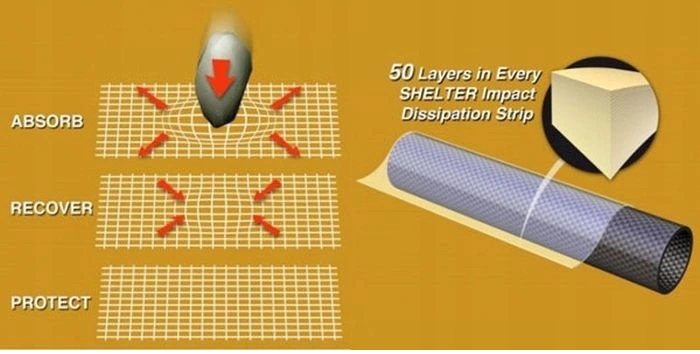 Shelter Off-Road имеет устойчивый к царапинам слой толщиной 0,2 мм. Под ним слой резины (вязкоэластичный) толщиной 1 мм. Такая композитная конструкция материала позволяет энергии удара «растекаться» по ремню, не передавая ее на элемент велосипеда.