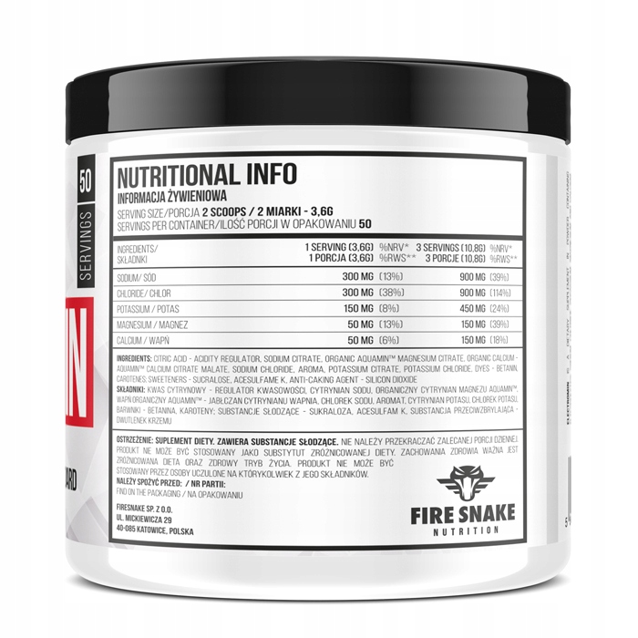 FireSnake Electromin — это порошкообразная пищевая добавка, являющаяся источником электролитов. Рекомендуется людям, которые рискуют потерять эти ценные активные ингредиенты, особенно тем, кто много и интенсивно тренируется, а также людям, работающим физически и выздоравливающим после болезней. Электромин доступен с фруктовым вкусом и содержит подсластители.