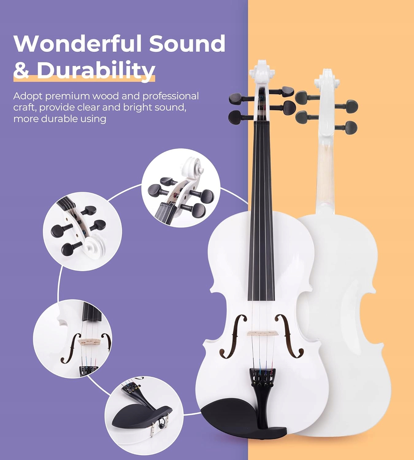 - [Красивая белая скрипка] Элегантная белая глянцевая отделка и лак, изысканный и стильный, обеспечивают привлекательный внешний вид, защищая древесину и сохраняя хорошую акустику. Не только для себя, но и идеальный подарок для друзей, семьи или любимого человека.