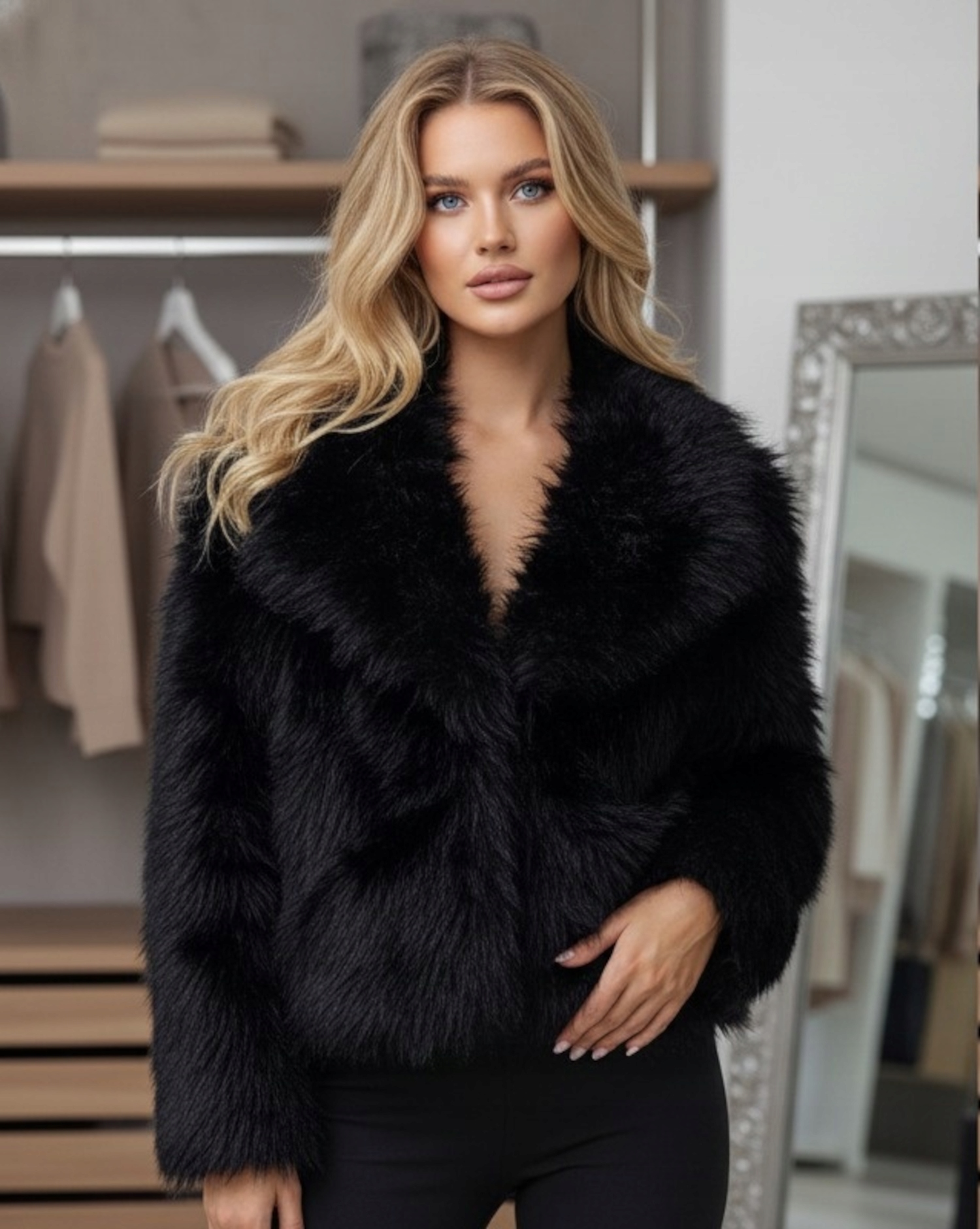ЭЛЕГАНТНОЕ ПАЛЬТО ЖЕНСКОЕ ИЗ ИСКУССТВЕННОГО МЕХА С ВОРОТНИКОМ ТЕПЛОЕ ЧЕРНОЕ S