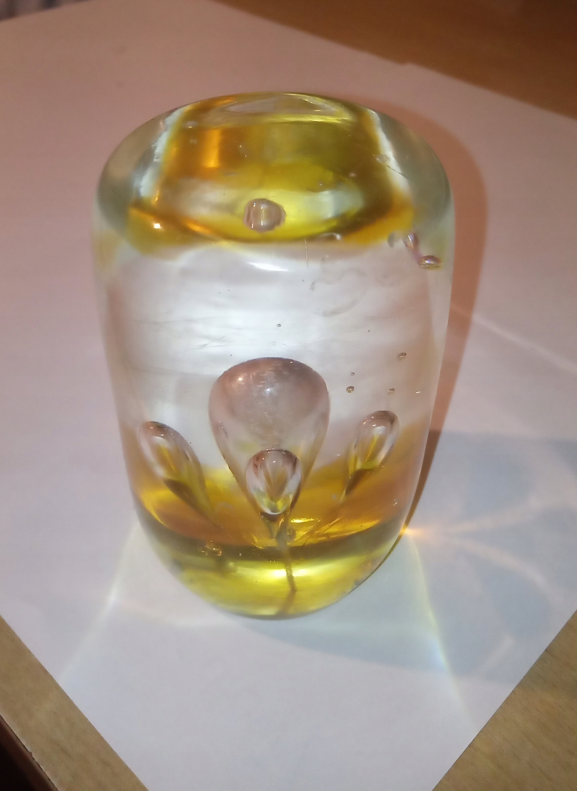Элегантная, идеальная бумажная кнопка, необходимая в каждом офисе и офисе. Стеклянный объект, , вероятно, происходит из Чешской Республики. Внимание обращается к внутренней части кнопки с пузырьками одинакового размера и цветами. Состояние предмета: очень хорошо, имеет небольшой дефект, видимый на одной из фотографий, что делает его еще более уникальным. Приблизительные размеры: высота 9 см, ширина 5,5 см, вес: 600 г. Возможные незначительные фабричные недостатки.
