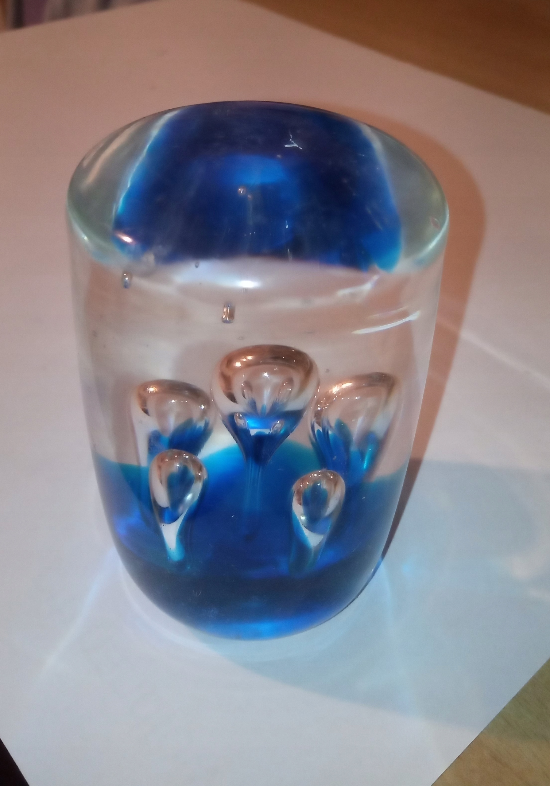 Элегантная, идеальная бумажная кнопка, необходимая в каждом офисе и офисе. Стеклянный объект, , вероятно, происходит из Чешской Республики. Внимание обращается к внутренней части кнопки с пузырьками одинакового размера и цветами. Состояние предмета: очень хорошо, имеет небольшой дефект, видимый на одной из фотографий, что делает его еще более уникальным. Приблизительные размеры: высота 9 см, ширина 5,5 см, вес: 600 г. Возможные незначительные фабричные недостатки.