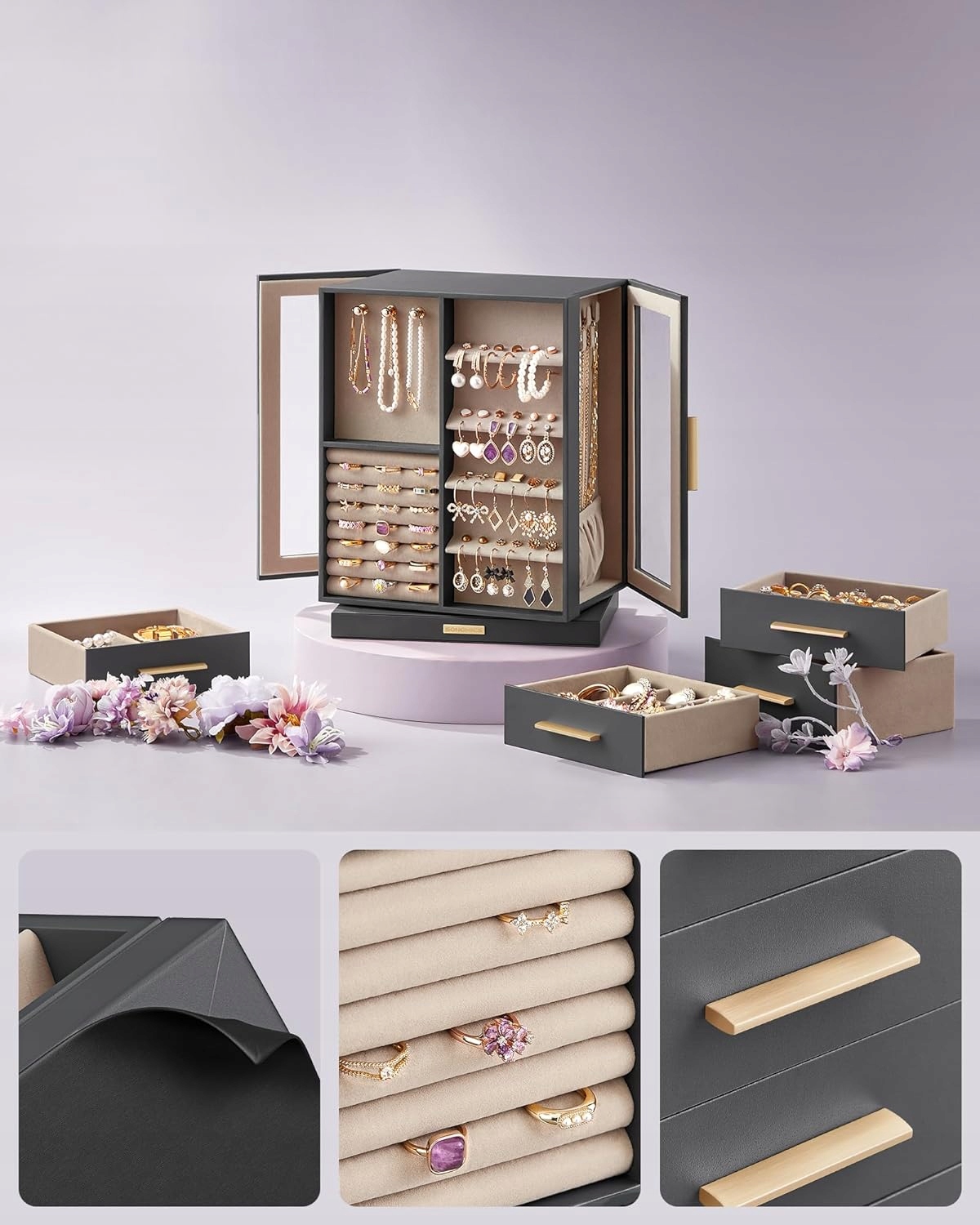 Вращение на 360 градусов: Наша шкатулка вращается на 360 градусов, что позволяет легко и быстро найти нужное украшение. Не нужно искать в закрытых ящиках или коробках — все доступно сразу.