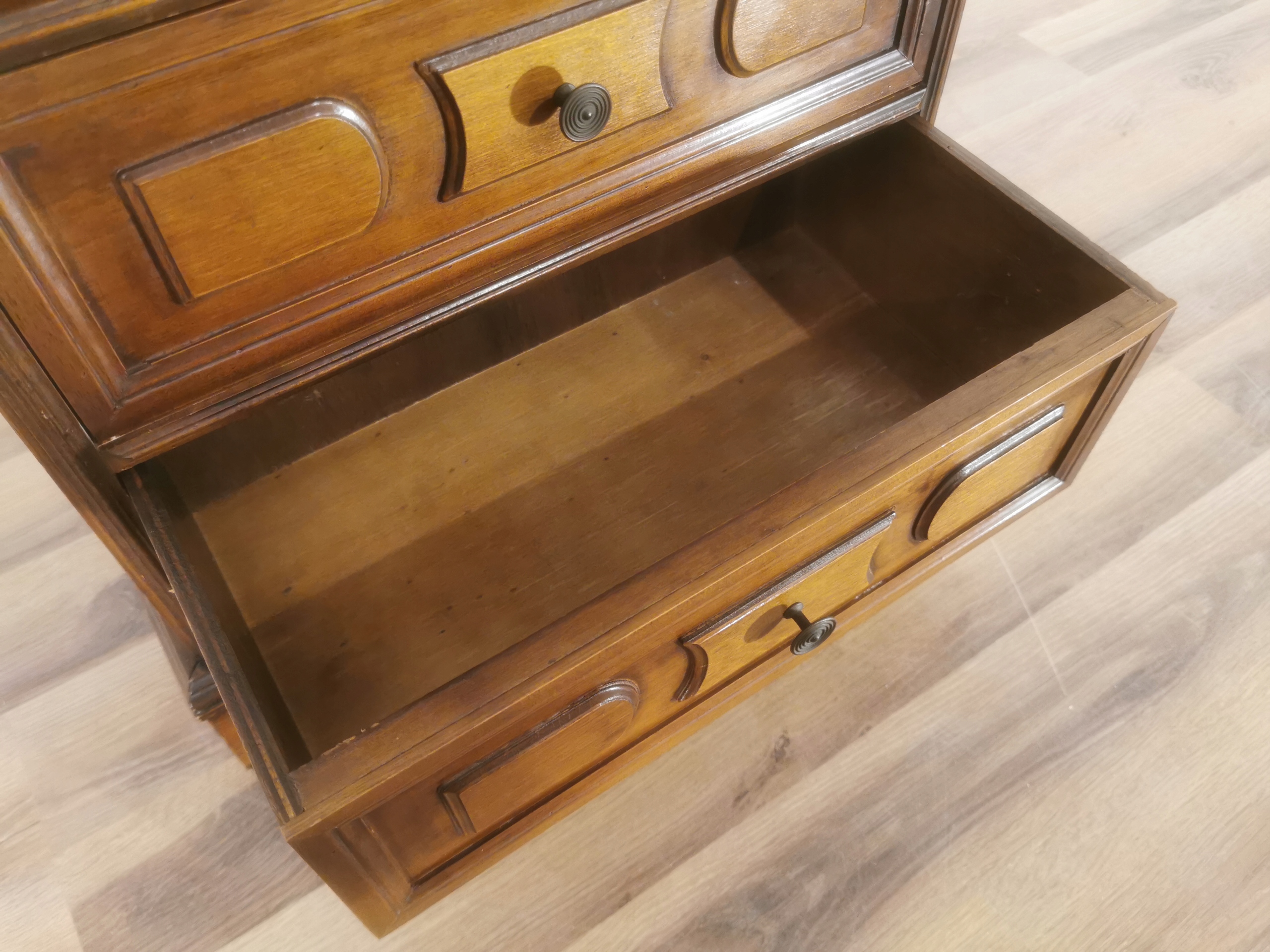 Переворот ящиков, изготовленный из тарелки, украшенной шпоном ольхи. Вырезанные элементы, сделанные из твердой древесины.