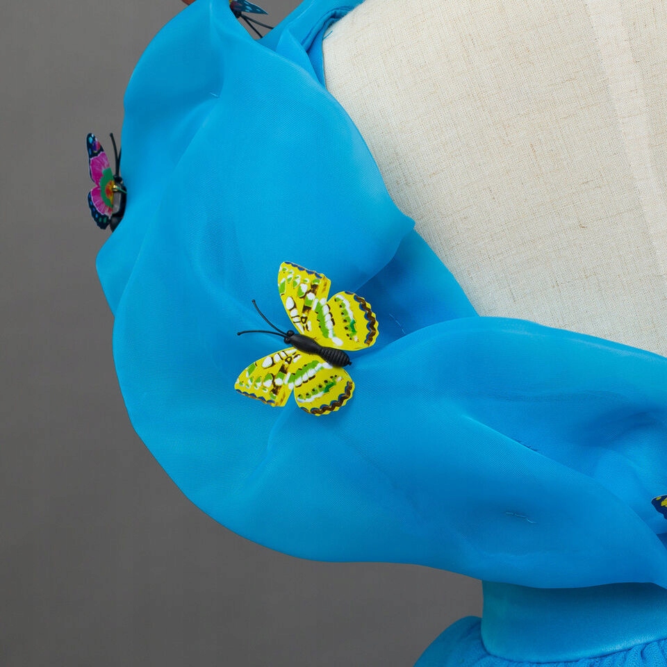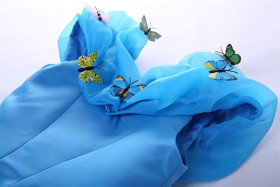 - Платье без рукавов, украшенное разноцветными бабочками, прикрепленными отдельно,