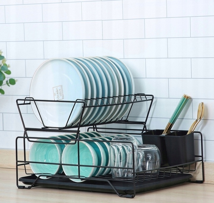 ЕЛЕГАНТНА ВЕЛИКА СІЧКА ДЛЯ СУШІННЯ ПОСУДУ, ДВА РІВНЕВА, МЕТАЛЕВА КРАПЕЛЬНИЦЯ, ЧОРНА XXL