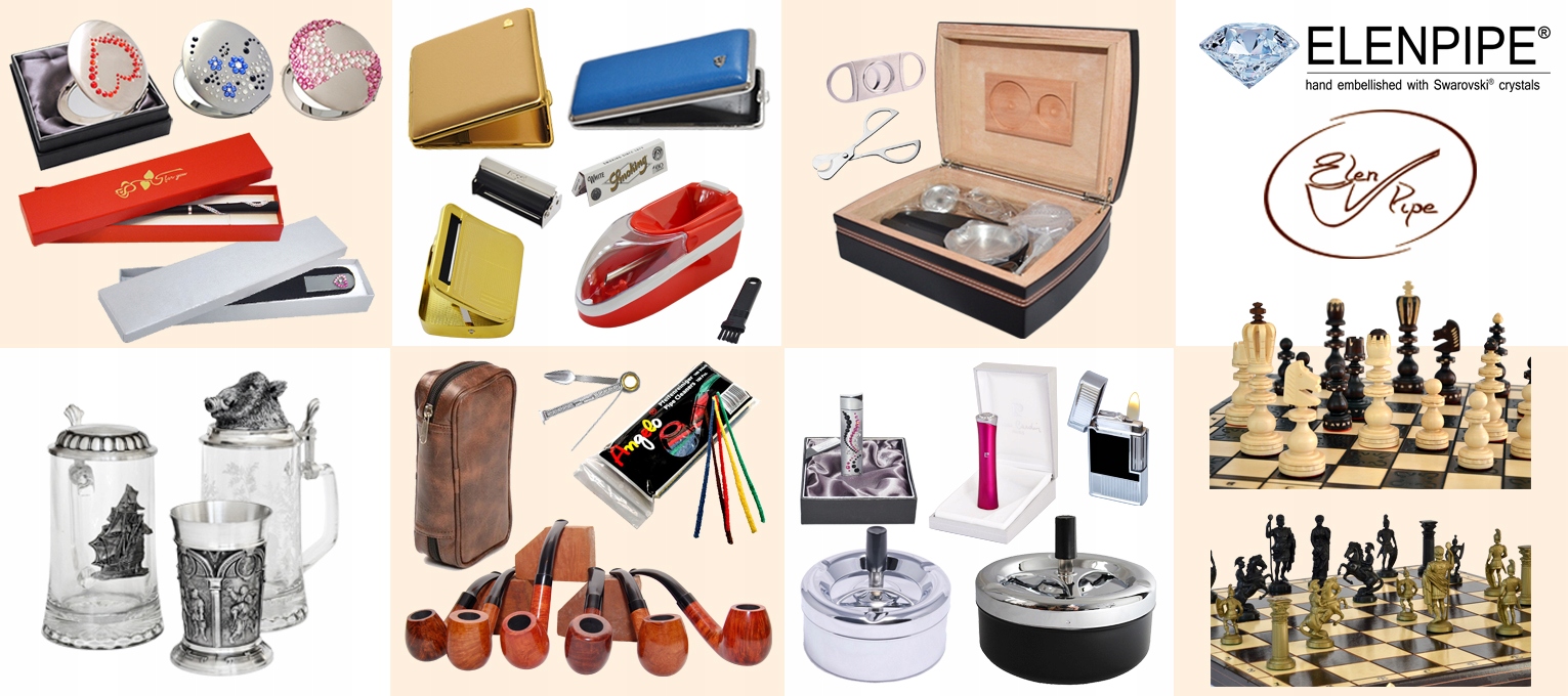 ELENPIPE Sp. з о.о. с 2000 года является прямым оптовым дистрибьютором более 1500 аксессуаров для курения, подарков и рекламных товаров, а также игр для вечеринок, таких как шахматы и нарды. Рекламная продукция: металлические, пластиковые, пьезо, газовые, бензиновые, гравировальные зажигалки; пепельницы; портсигары; зеркала; файлы.