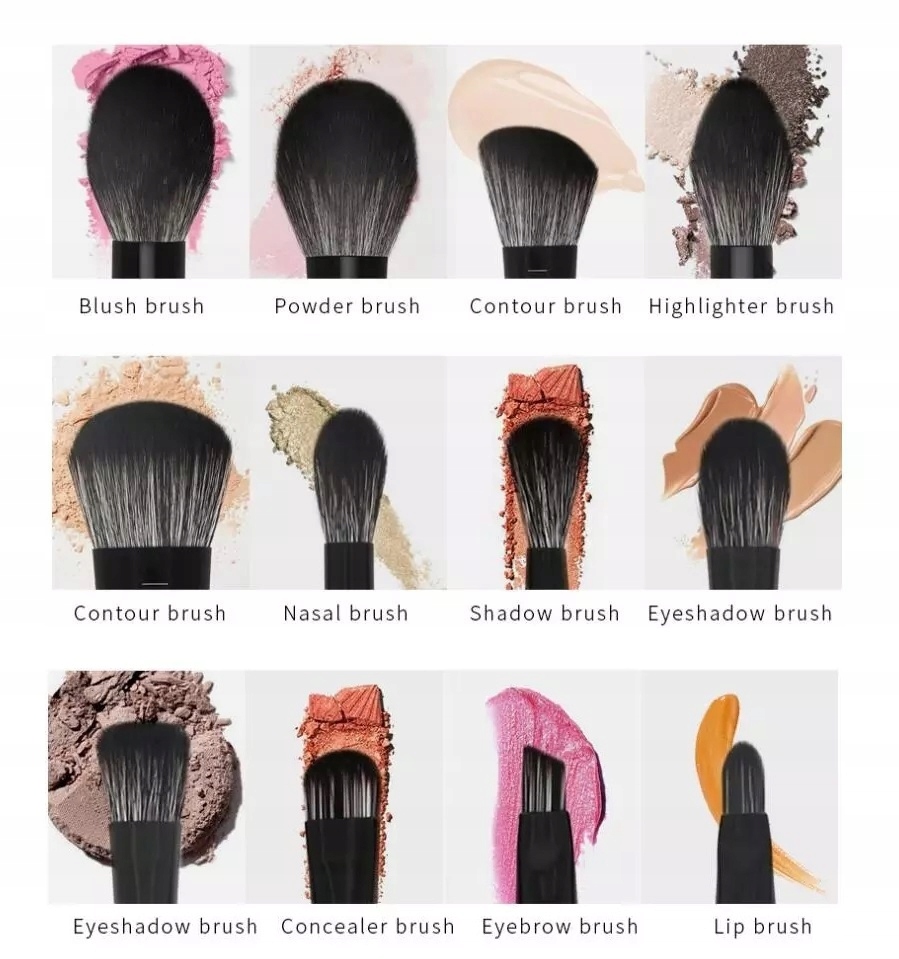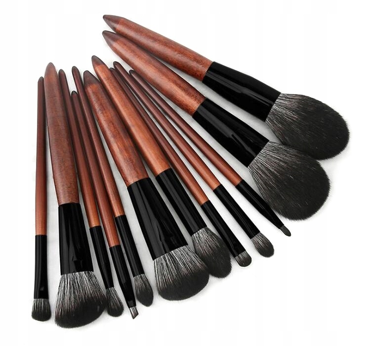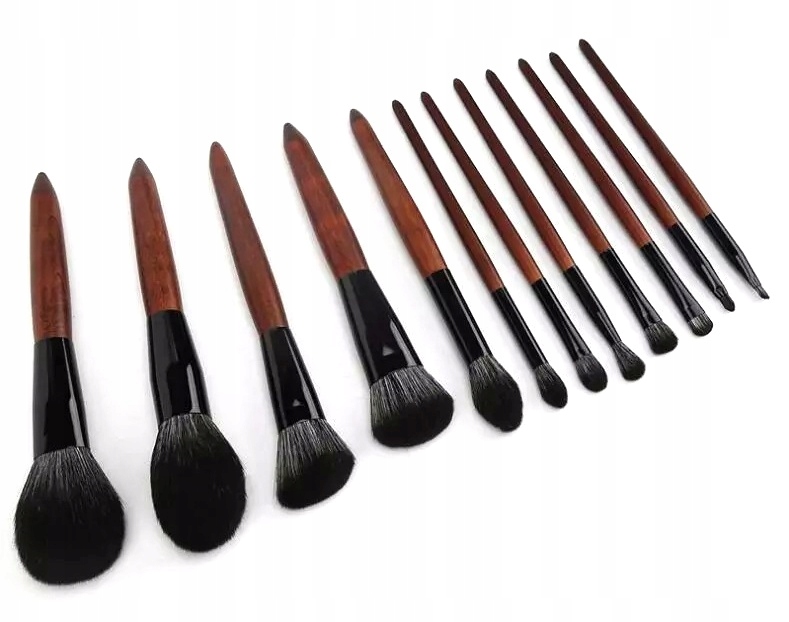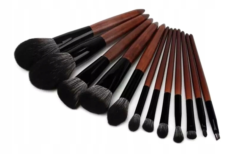 Набор из 12 профессиональных кистей для макияжа, изготовленных из высококачественной синтетической щетины, закрепленных в металлическом наконечнике, с деревянной ручкой.