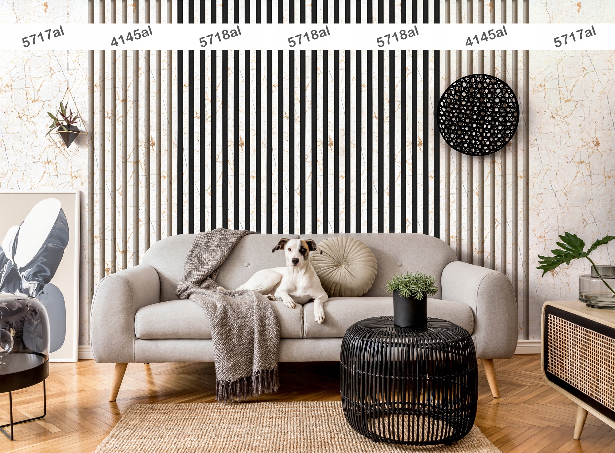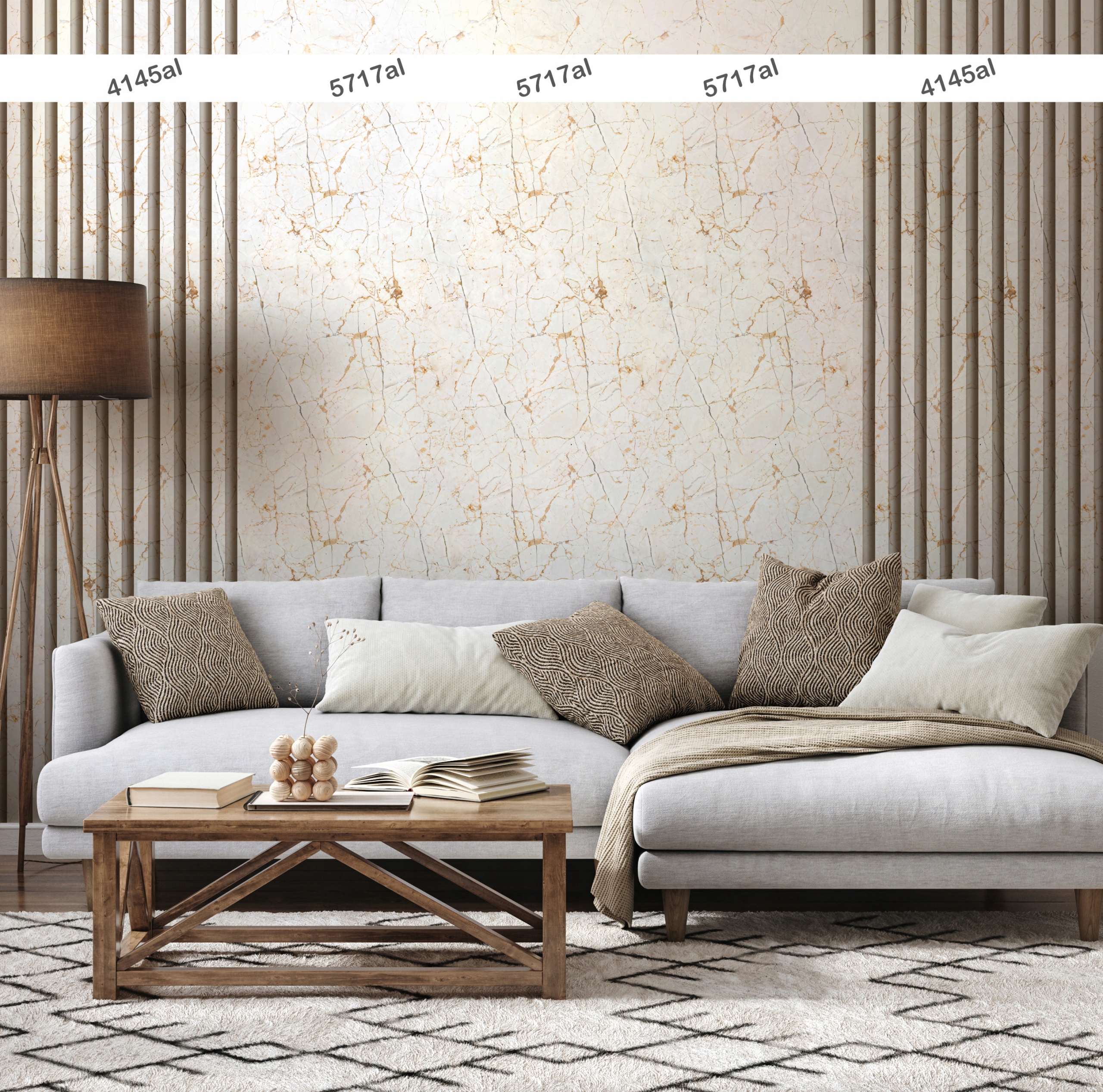 Обои можно комбинировать со светлым мраморным рисунком (5717al) и рисунком мраморных ламелей на темном фоне (5718al), создавая свою индивидуальную композицию, подходящую для помещения. Панели могут соединяться с любой стороны и в различных конфигурациях.