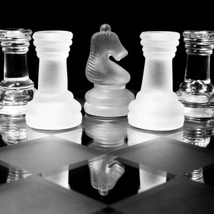 Этот элегантный шахматный набор включает в себя доску из матового и прозрачного стекла.