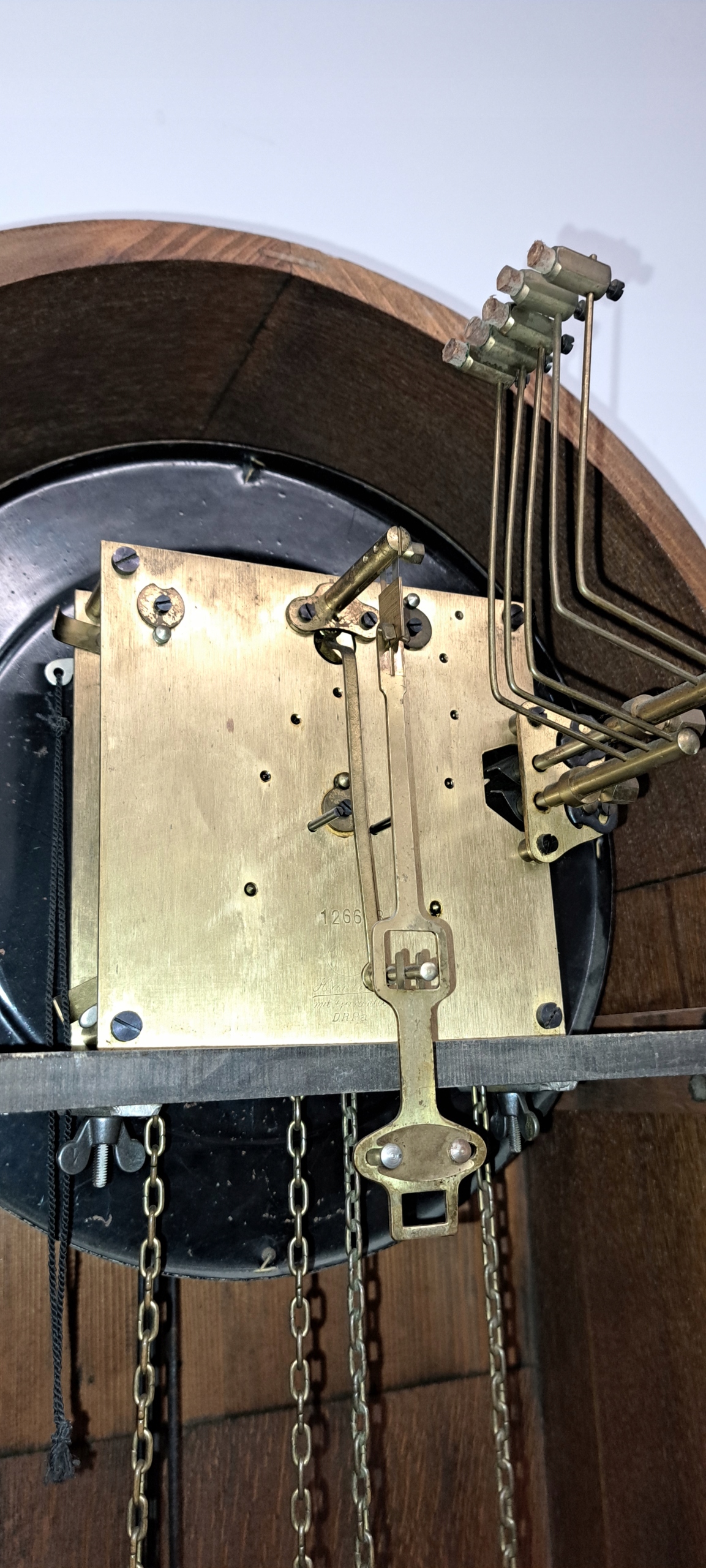 ЧАСЫ ОТМЕЧАЮТ ПОЛОВИНУ И ПОЛНЫЕ ЧАСЫ, С КРАСИВЫМ ГЛУБОКИМ 2-ТОНАЛЬНЫМ ЗВУКОМ СТРУННОГО ГОНГА, БИММ............БАММ.......КОЛИЧЕСТВО БОЙКОВ В ЗАВИСИМОСТИ ОТ ЧАСА, НАТЯЖЕНИЯ ЦЕПИ ДОСТАТОЧНО НА 7 ДНЕЙ РАБОТЫ ЧАСОВ, ПОТОМ ИХ НУЖНО СНЯТЬ СНОВА ПОДНЯТЬ ВЕСЫ.