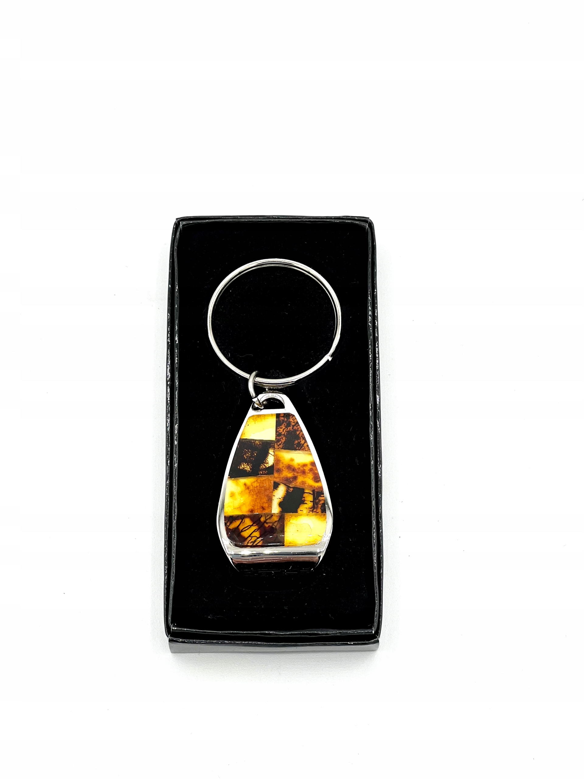 Брелок с янтарной мозаикой из мелких кусочков балтийского янтаря различных цветов.