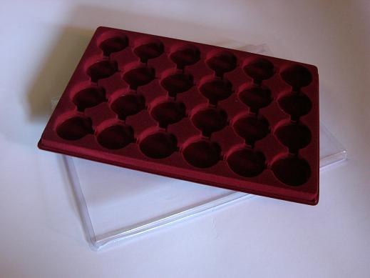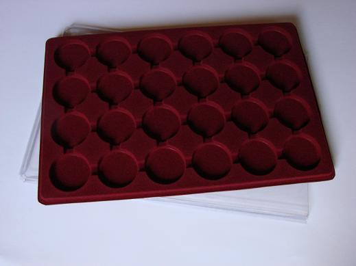 Поддон, рассчитанный на 24 монеты номиналом 20 злотых, с крышкой. Круглые отверстия диаметром 45 мм.Новый поддон общими размерами 330 х 225 мм с защелкой из закаленной фольги.