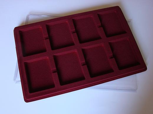 Поддон подготовлен для размещения 8 коробок «GRADING» Размер слота: 65мм x 85мм Новый поддон общими размерами 330x225 мм с защелкой из закаленной фольги.