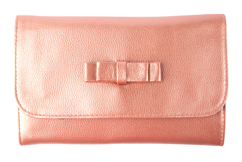 Элегантный футляр для кистей и аксессуаров для макияжа лососевого металлического цвета, увенчанный очаровательным бантом.