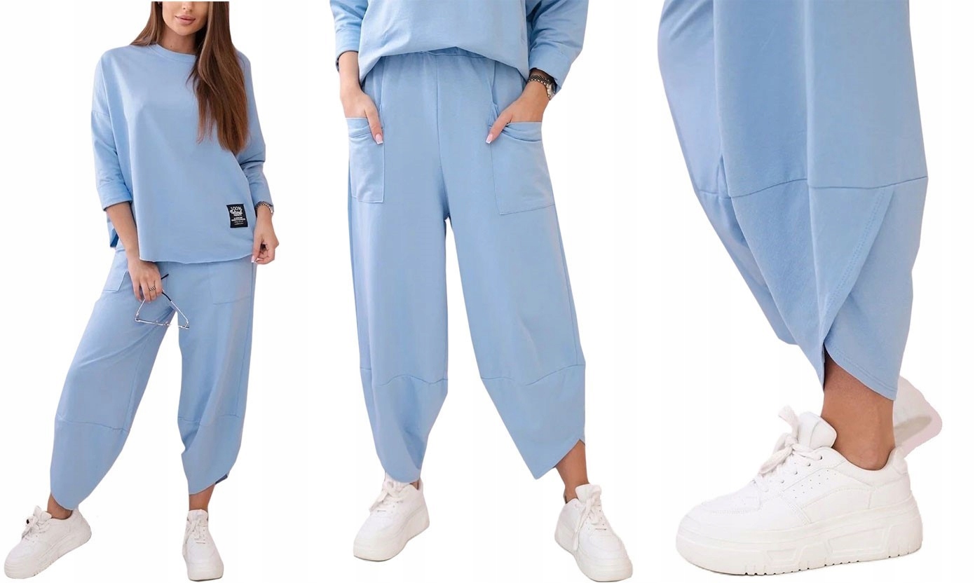 Итальянский набор, асимметричная блузка, туника, отличающаяся сшиванием и отступами по бокам, в сочетании с штанами с разрезом тюльпана.
