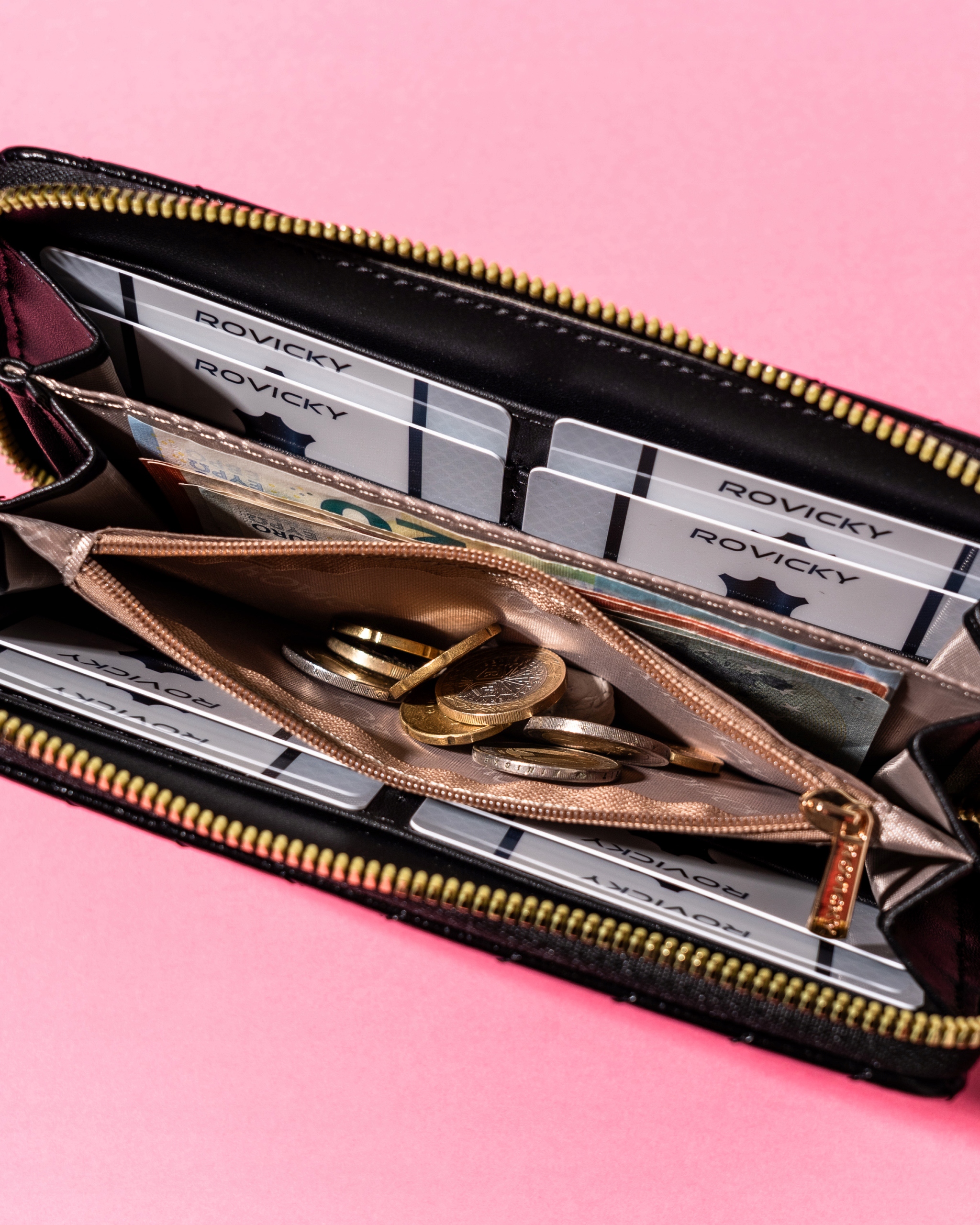 Кроме того, 2 больших отделения для документов позволяют безопасно хранить важные документы, например свидетельство о регистрации, что делает этот кошелек чрезвычайно практичным решением для повседневного использования.