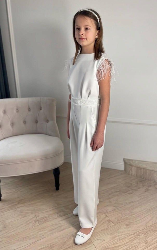 Елегантний комбінезон з пір'ям і мереживом кольору екрю 158