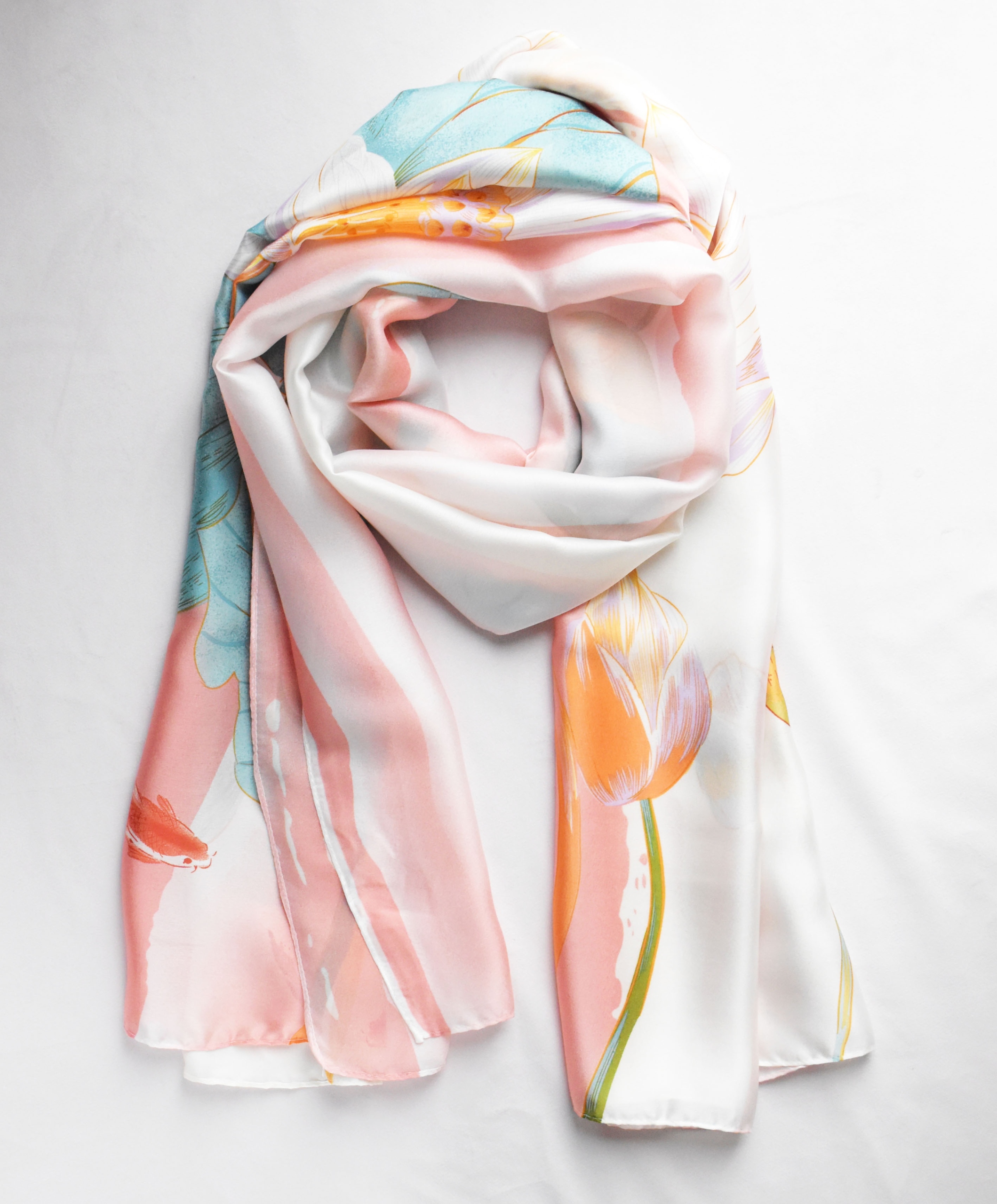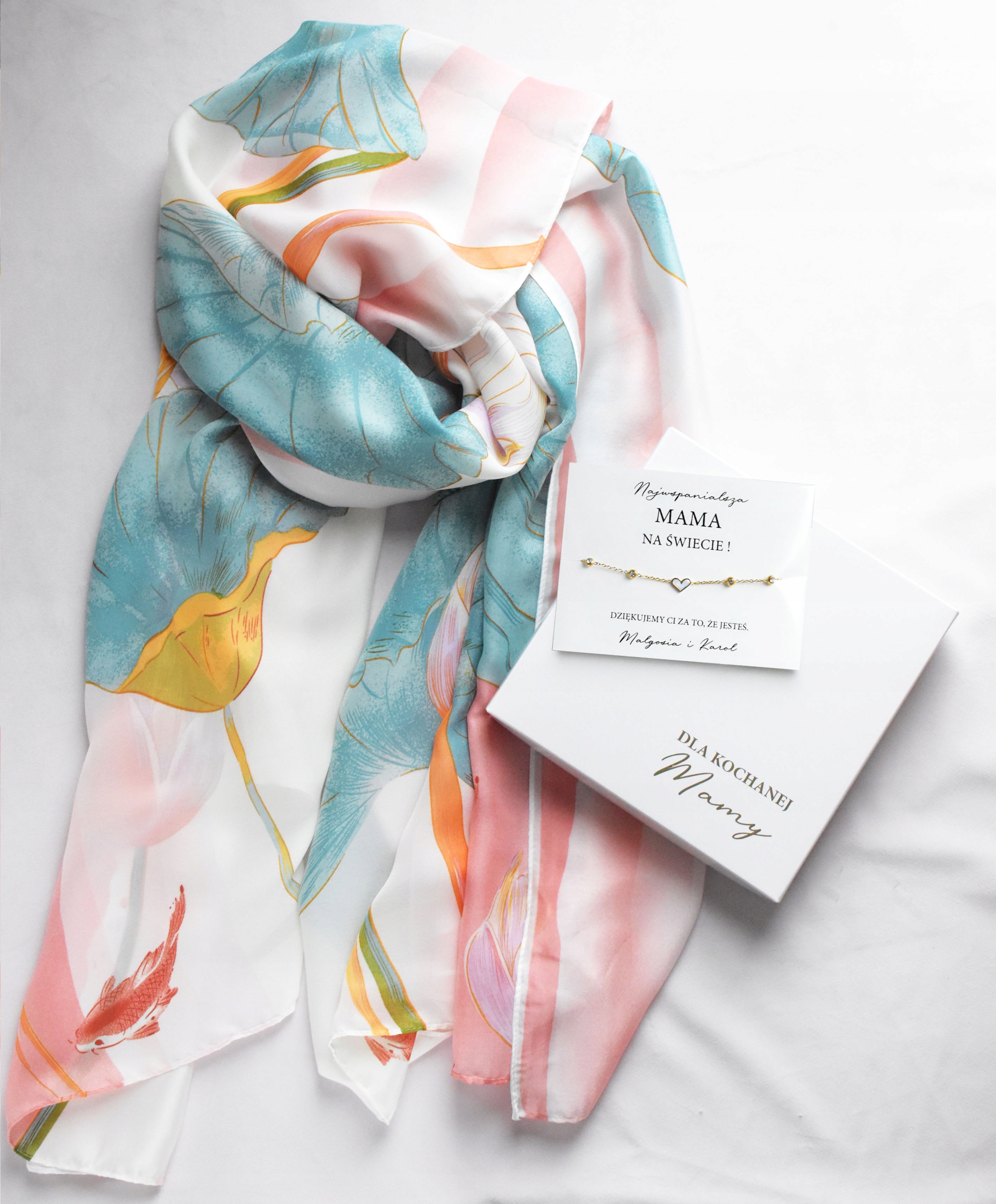 Шарф разноцветный, размеры 90х90 см, материал полиэстер. Банкнота весом 240 г. Браслет из нержавеющей стали. Белая коробочка с золотой надписью, перевязанная лентой в тон всему цвету (обычно пудрово-розовая или кремовая).