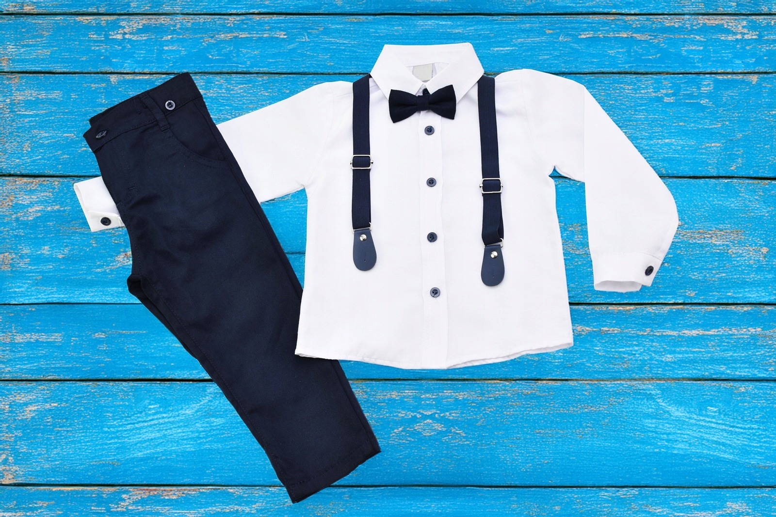 Элегантный комплект для мальчика, идеально подходящий для особых случаев - праздников, дней рождений, причастий или семейных вечеринок. Стильный комплект состоит из белой рубашки, темно-синих брюк, подтяжек и галстука-бабочки – создавая классический образ маленького джентльмена.