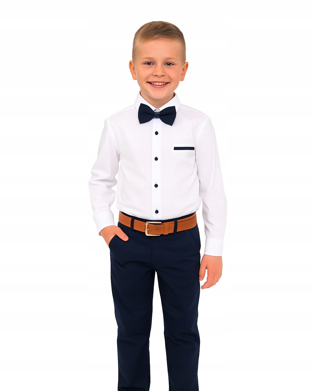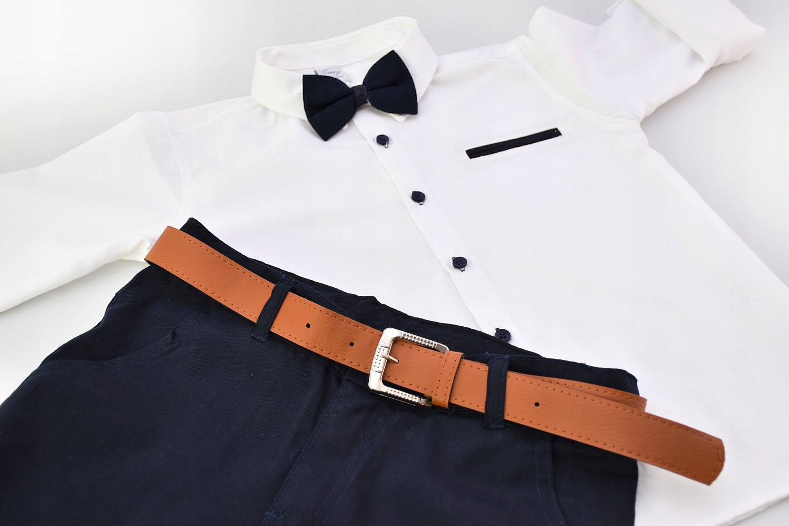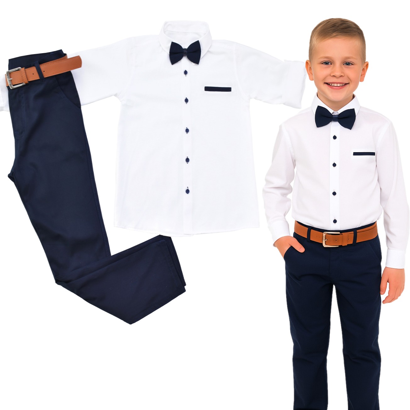 ЭЛЕГАНТНЫЙ КОМПЛЕКТ ДЛЯ МАЛЬЧИКОВ, БЕЛАЯ РУБАШКА, ТЕМНО-СИНИЕ БРЮКИ, РЕМЕНЬ, ГАЛСТУК-БАБОЧКА, 12л.