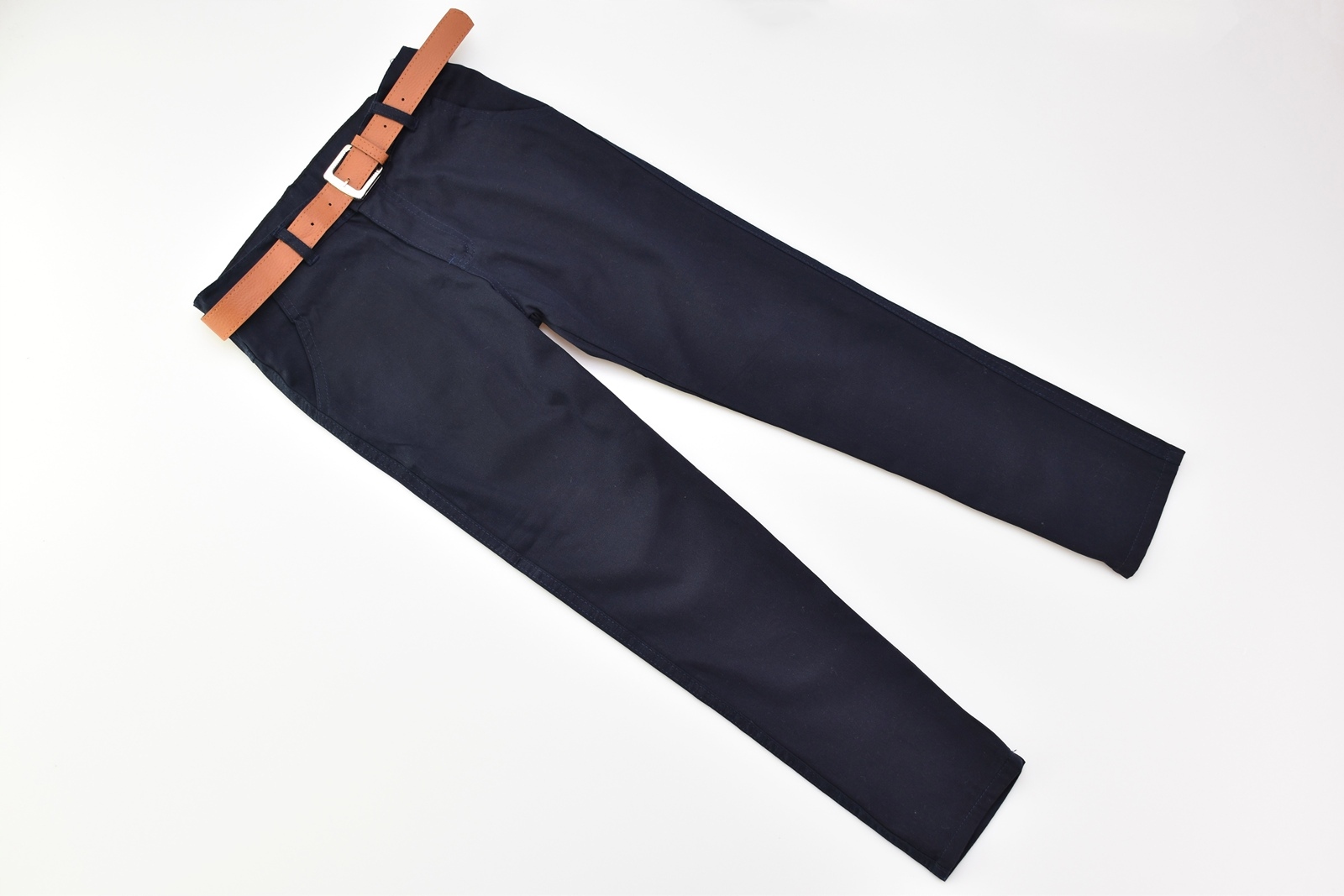 - Темно-синие брюки с регулировкой по обхвату талии (пуговицы + внутренняя резинка).