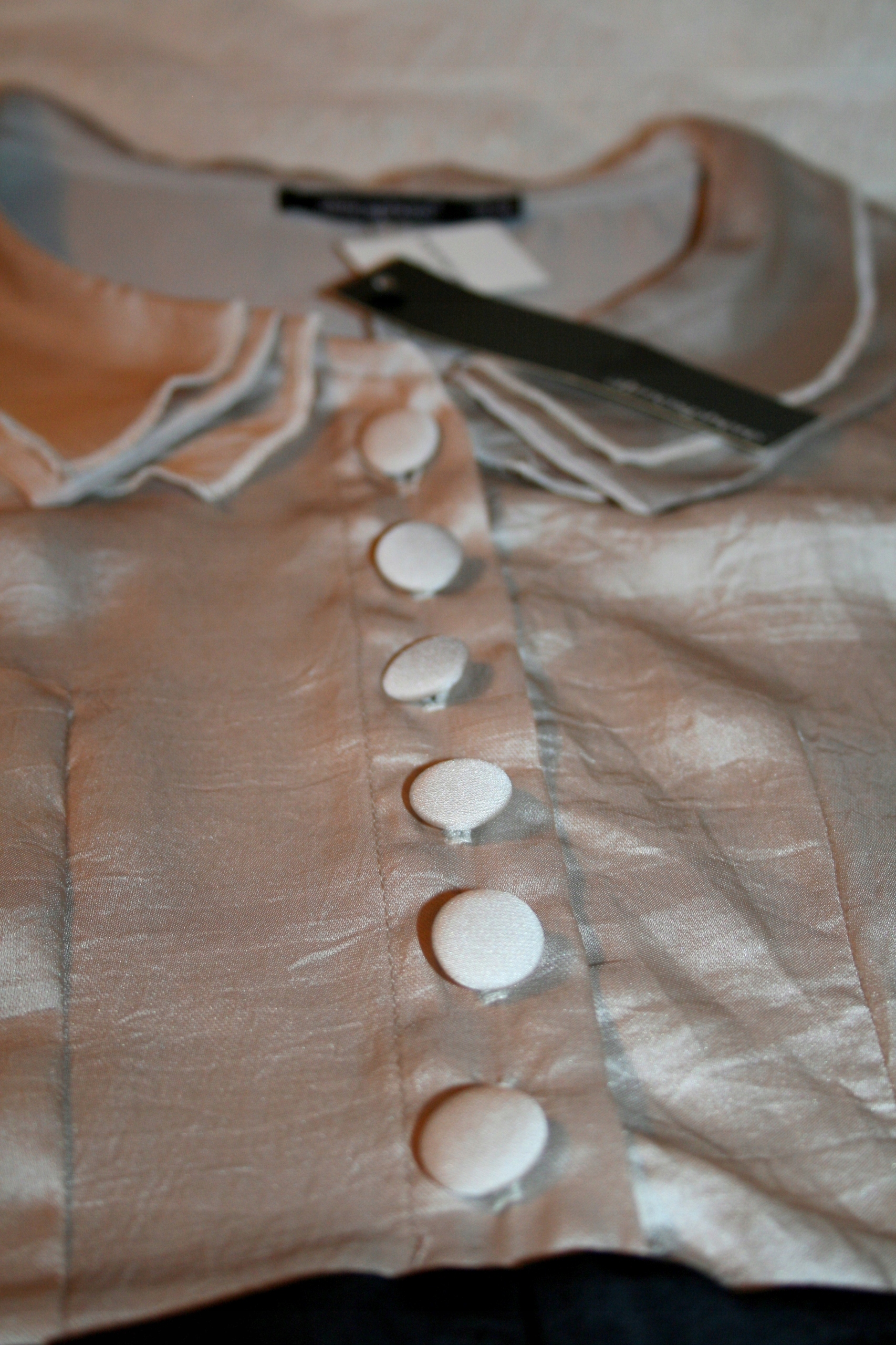 Чрезвычайно элегантный женский костюм с короткими ногами, с черным дном и горы, подражающими рубашками в оттенках серого золота, закрепленных кнопками. Кроме того, молния на боку, обеспечивающая более быструю заправку костюма. Конверт, двойной вырез с поднятым воротником. На талии ремень ремня придерживался талии, подчеркивая талию. Кроме того, материальная полоса включена. Короткие ноги с карманами по бокам. Костюм из гладкой ткани для лица. Это прекрасно работает каждый день и более элегантный случай.