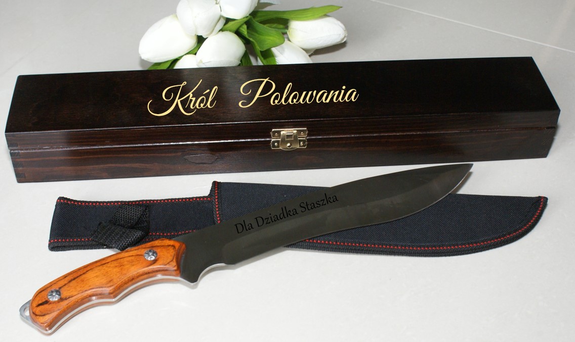 Предлагаю элегантный охотничий нож с вашей гравировкой в элегантной лакированной деревянной коробке.