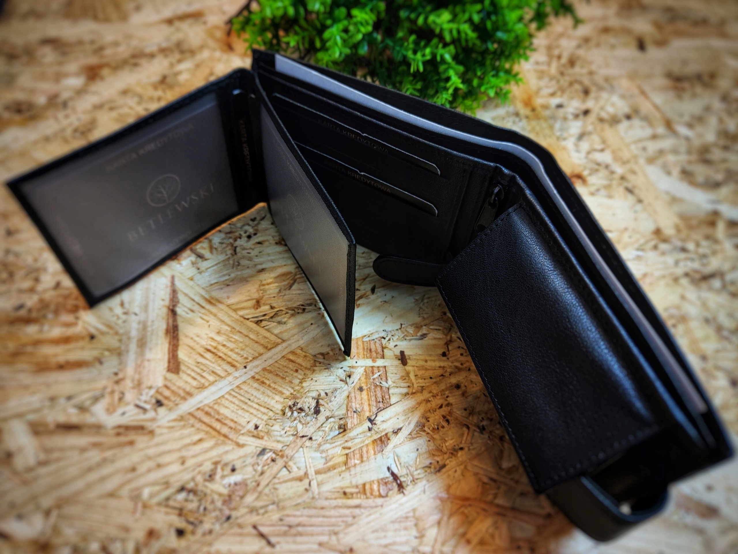 - КОЖАНЫЙ КОШЕЛЕК OPTMAL от BETLEWSKI – необходимая вещь для каждого мужчины, которая удовлетворит требования даже самых взыскательных, ведь Кошельки Betlewski — лучший выбор для всех, кто ценит безопасность и практичные решения. Он может показаться небольшим, но вы можете быть уверены, что в нем поместится все необходимое. Вы найдете легкодоступные отделения для удостоверения личности, водительских прав или фотографий ваших близких, а также 3 кармана для платежных карт, которыми вы пользуетесь каждый день. Внутренняя часть кошелька закрывается застежкой-кнопкой. Несмотря на компактные размеры, этот современный мужской кошелек имеет множество отделений для денег и документов, в том числе отделение на молнии посередине кошелька, которое защитит вас от потери важной купюры или других мелких вещей. Кошелек оснащен технологией RFID Secure, которая блокирует карты от несанкционированного сканирования.
