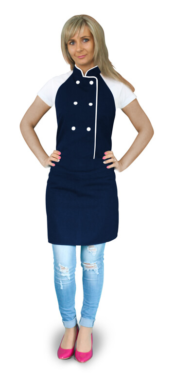Целое было элегантно закончено с двойными кнопками и обрезкой. Фартук достигает колена.