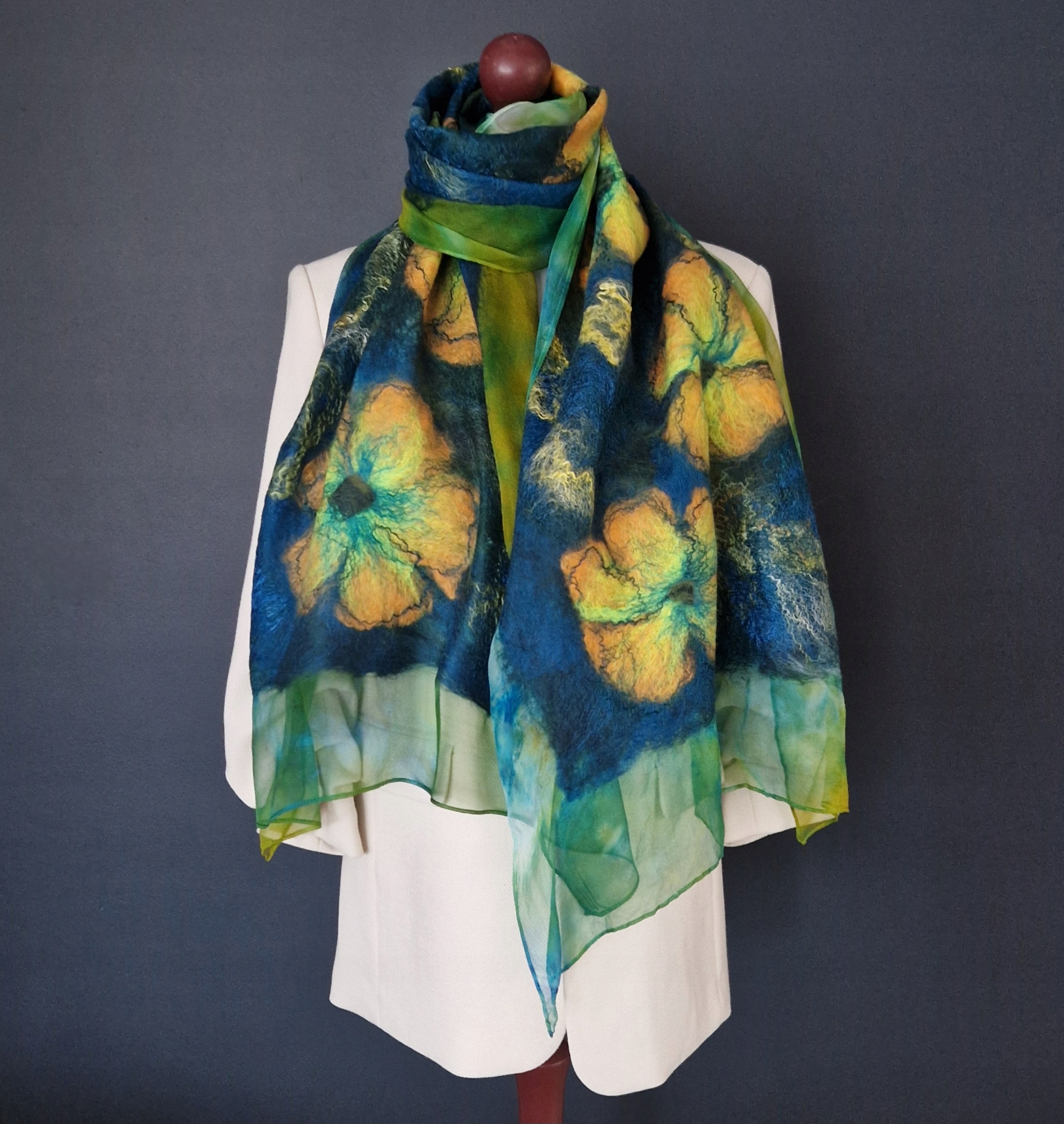 Ручный шарф из шелкового шифона и тонкой шерсти австралийских мерино. Красивый и уникальный. Украшен шелковыми волокнами. Воздушное, легкое, нежное и горькое. Вы можете носить его небрежно обернутую вокруг шеи и брошены на плечи. Масштабные валики на шелковом шифоне.