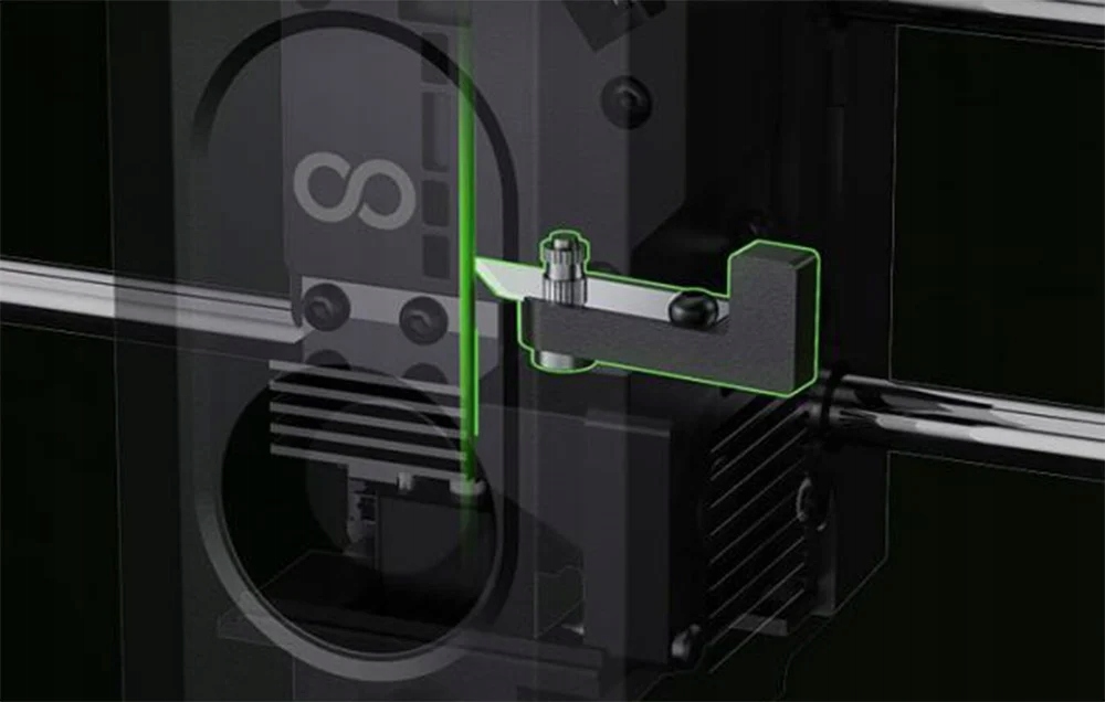Двойной экструдер из закаленной стали обеспечивает плавную и точную подачу материала даже при печати на высоких скоростях. Встроенный автоматический нож для обрезки нити позволяет быстро и точно отрезать и отвести материал, устраняя проблему засорения сопел и повышая общую надежность устройства.
